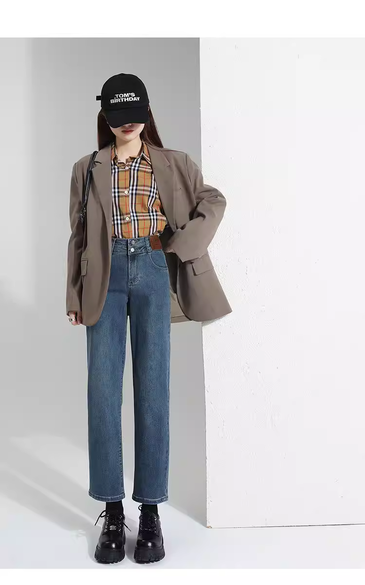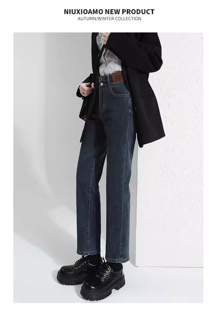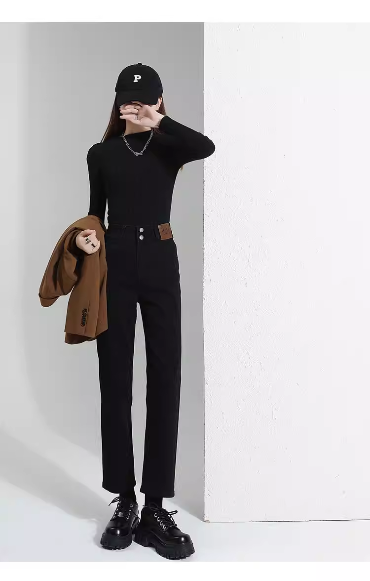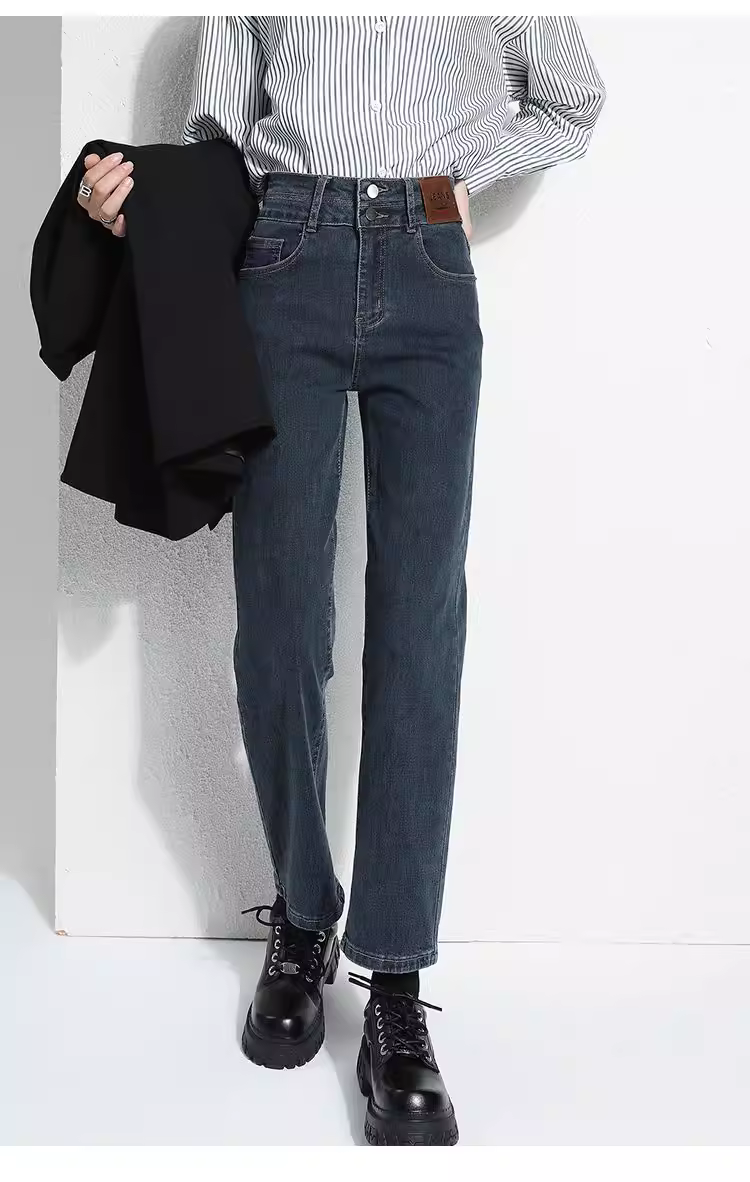 Quần jeans nữ La Chapelle lót lông dày, dáng ôm, ống lửng, kiểu dáng mới thu đông 2025, cạp cao, ống thẳng, kiểu dáng quần thuốc lá