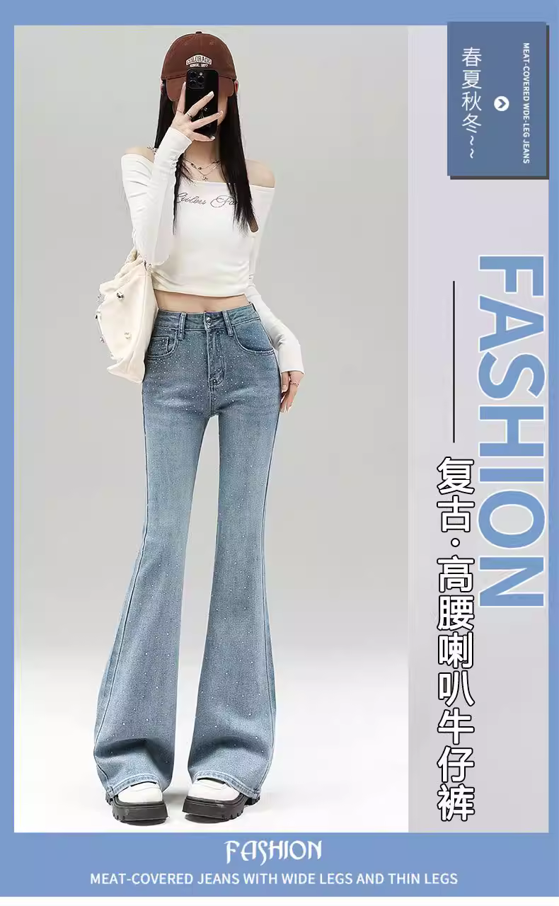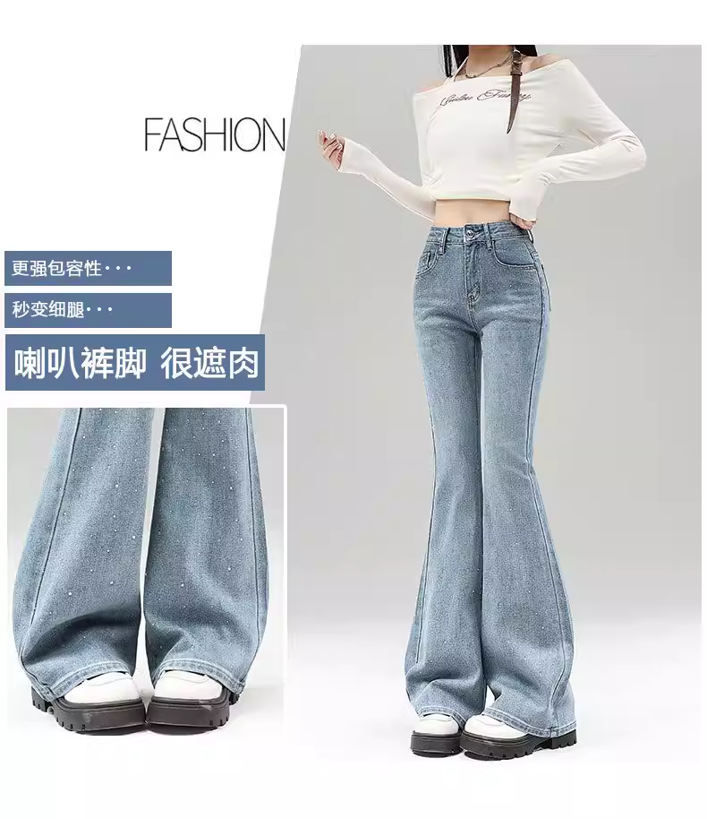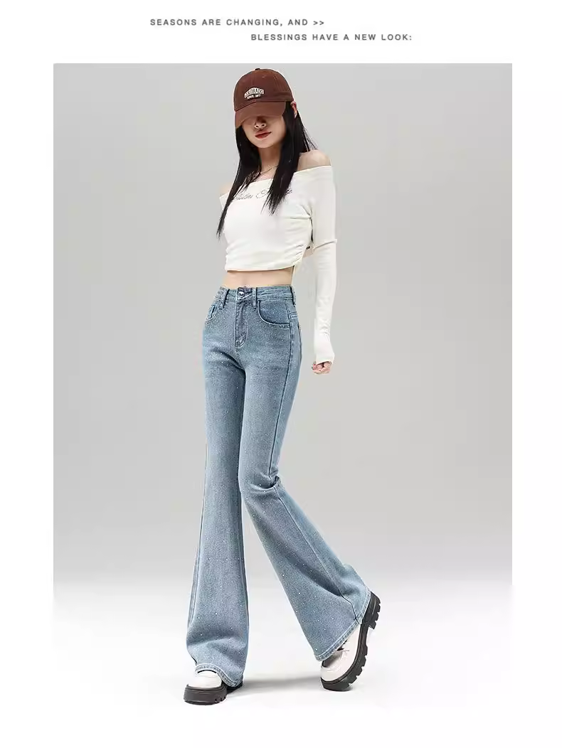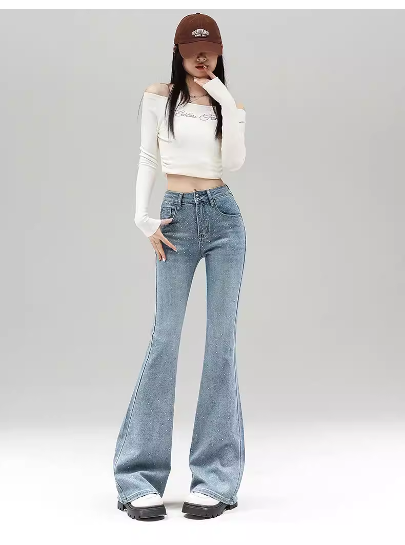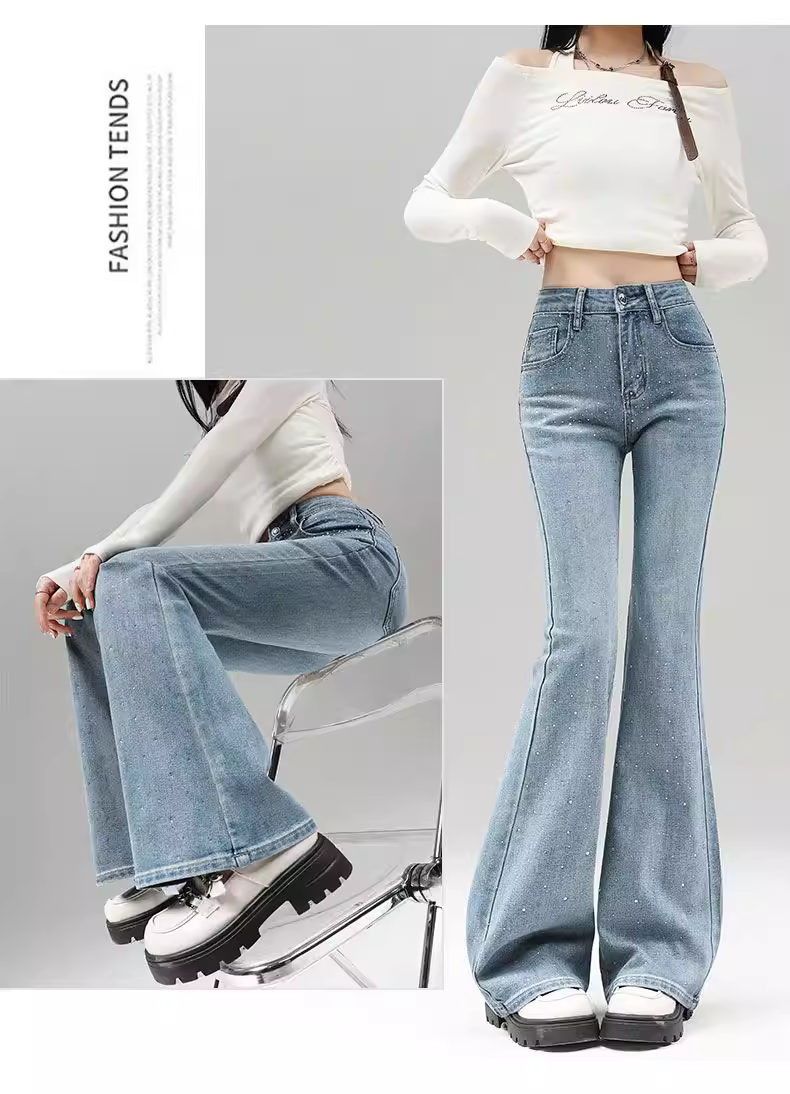Quần jeans nữ La Chapelle màu sáng, dáng loe, không bó sát, kiểu mới thu đông 2025, cạp cao, đính đá, tôn dáng, ống chuông