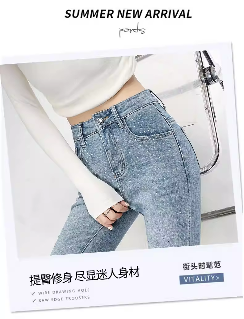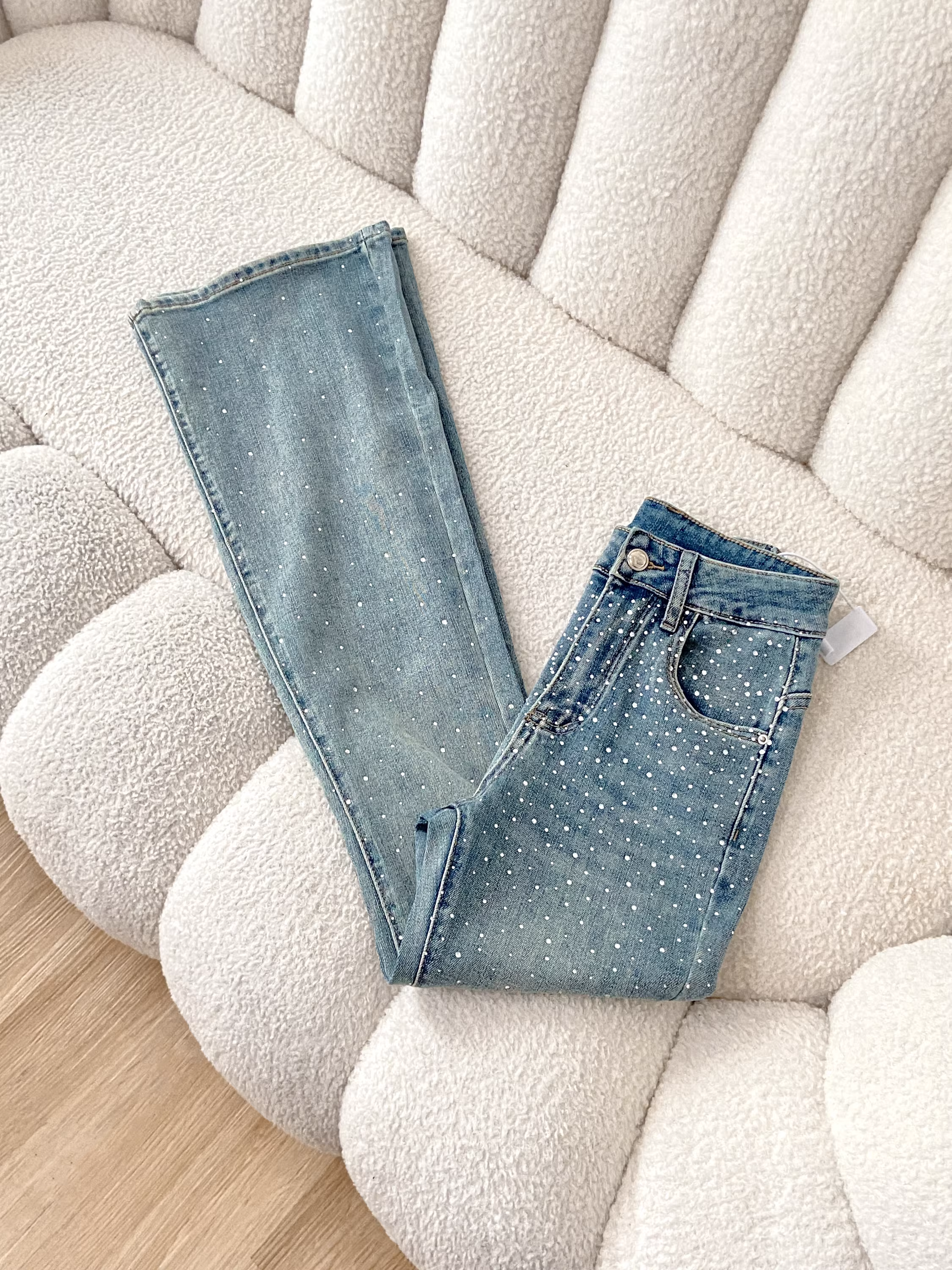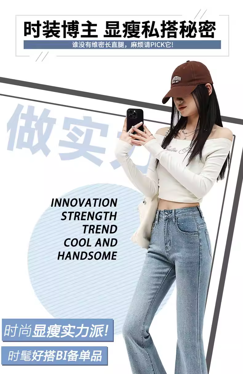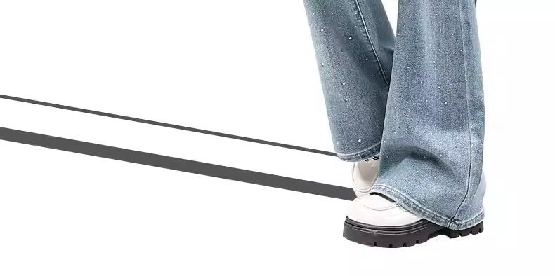 Quần jeans nữ La Chapelle màu sáng, dáng loe, không bó sát, kiểu mới thu đông 2025, cạp cao, đính đá, tôn dáng, ống chuông
