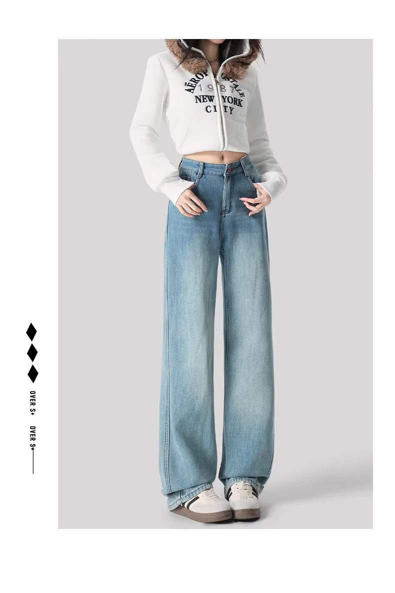 - Quần jeans nữ La Chapelle màu xanh nhạt, cạp cao, ống rộng, kiểu dáng mới thu đông 2025, chất liệu mềm mại, dáng thẳng, dài chạm sàn.
