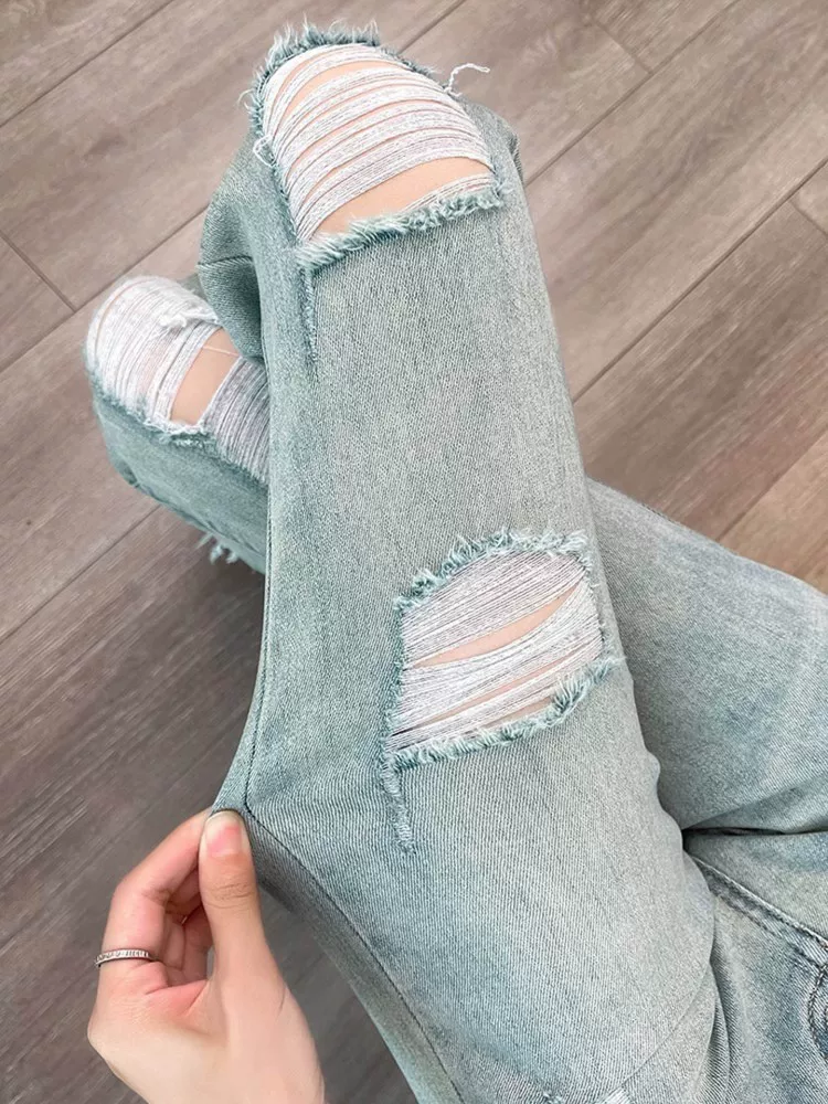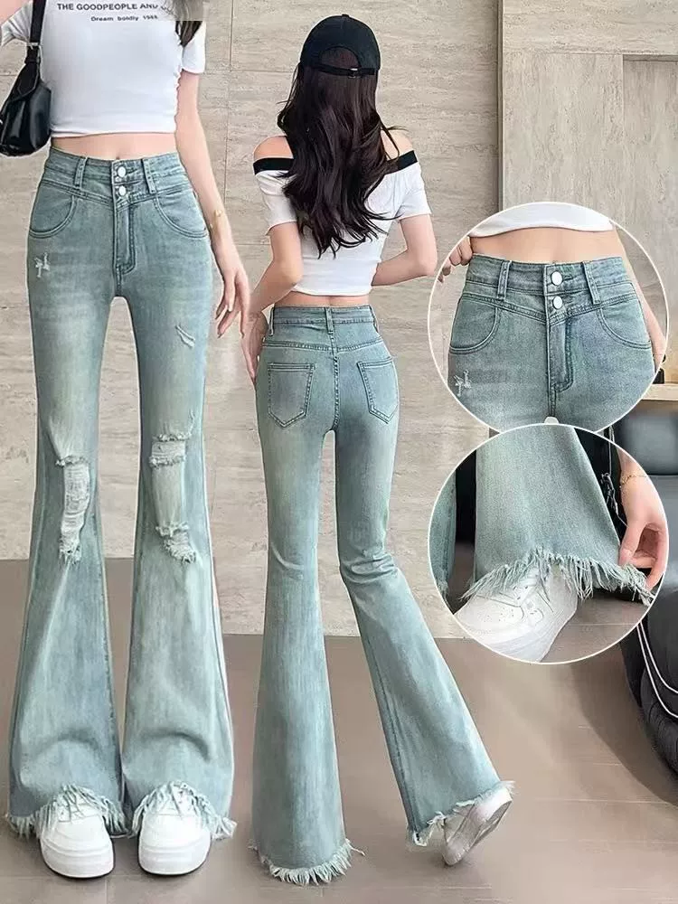 - Quần jeans nữ ống loe rách, hè 2025, kiểu dáng mỏng, size lớn, cạp cao, co giãn, che hông, quần bootcut tôn dáng