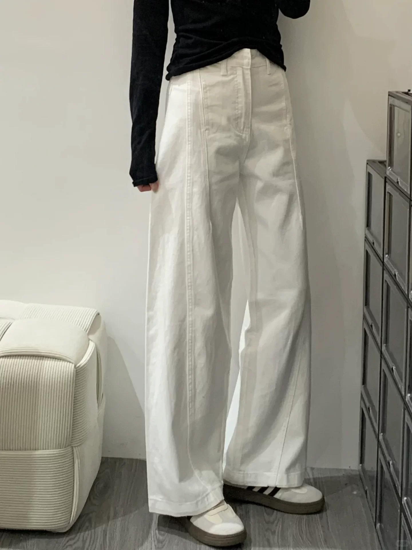 Quần jeans nữ ống rộng dáng cong màu trắng, kiểu mới hè 2025, size lớn, cạp cao, che hông, tôn dáng, ống thẳng.