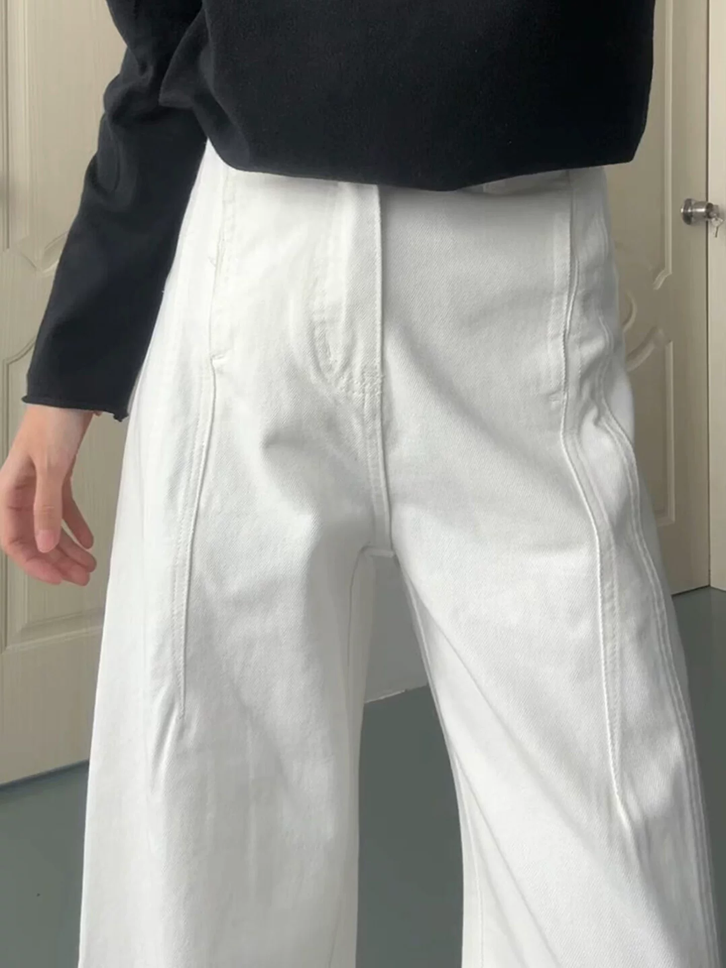 Quần jeans nữ vạt cong màu trắng, thu đông 2025, size lớn, cạp cao, dáng rộng, tôn dáng, quần ống rộng dáng sickle.