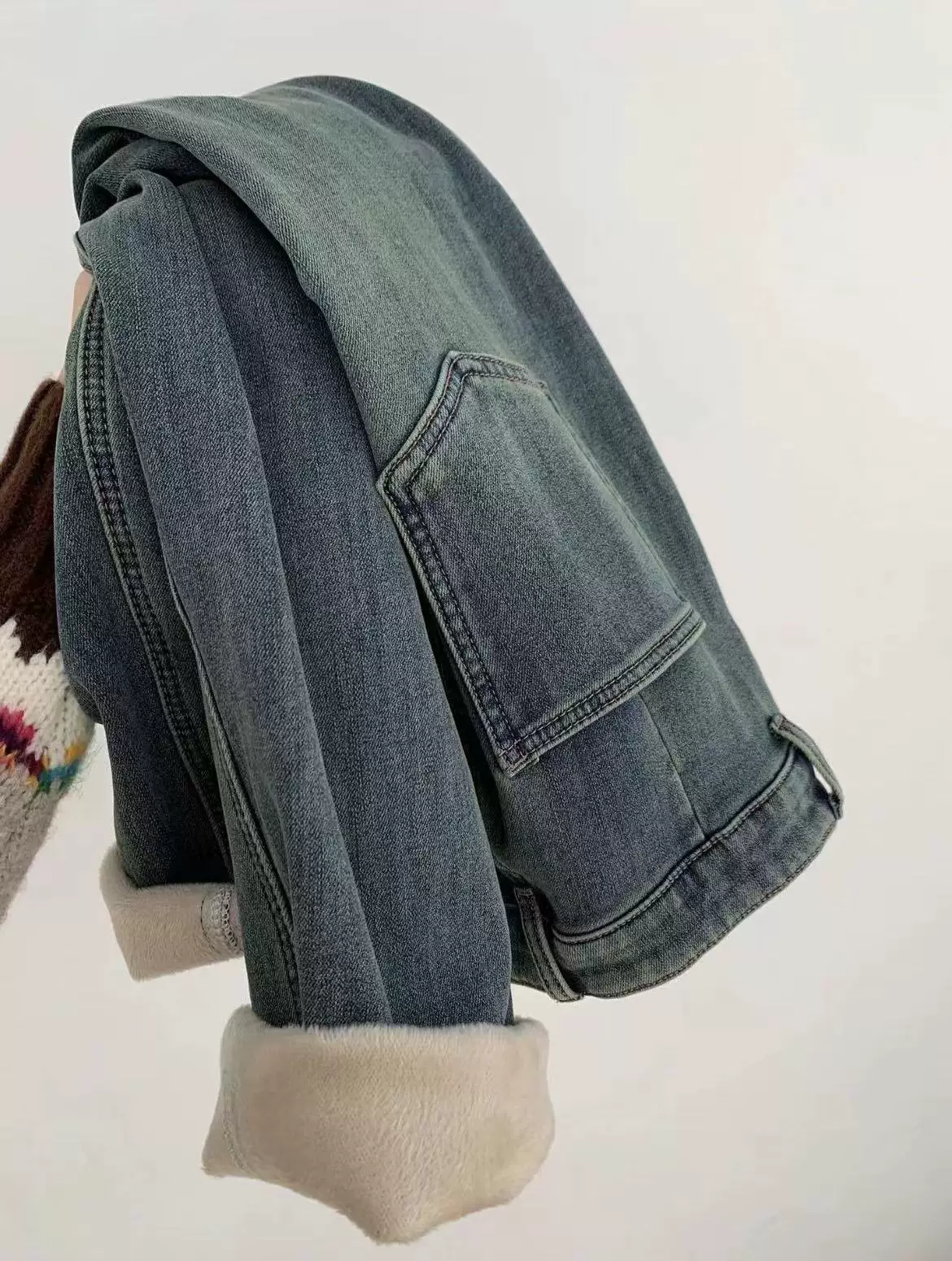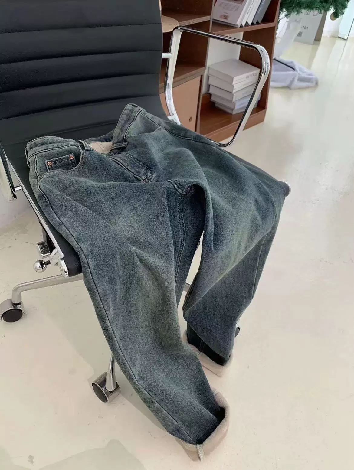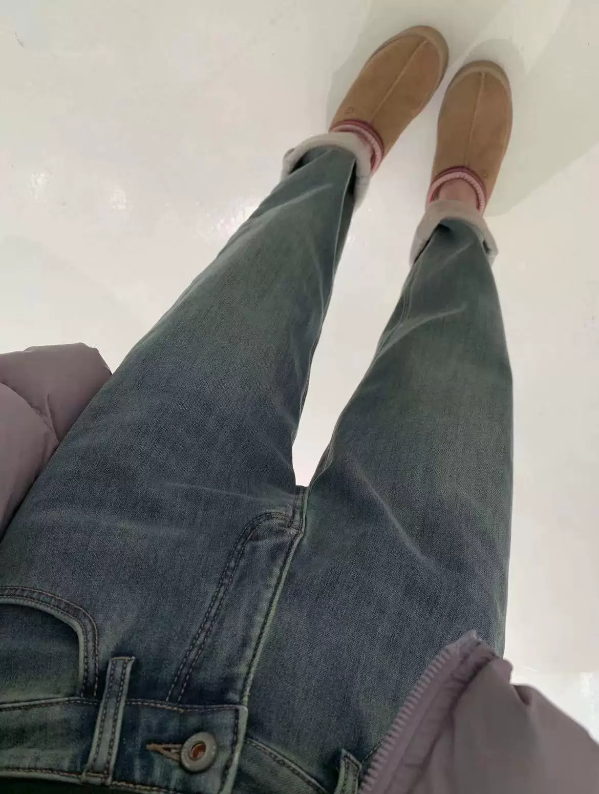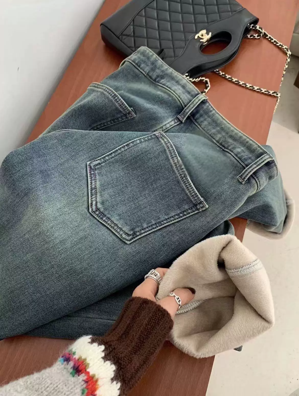 - Quần jeans ống đứng dày dặn lót lông màu xanh cổ điển dành cho nữ, thu đông 2025, size lớn, cạp cao, dáng rộng, tôn dáng