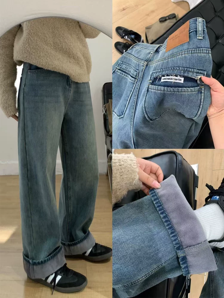 Quần jeans ống đứng nữ mùa đông 2024 kiểu mới lót lông dày dặn, size lớn, cạp cao, dáng rộng, che hông, tôn dáng, quần ống rộng