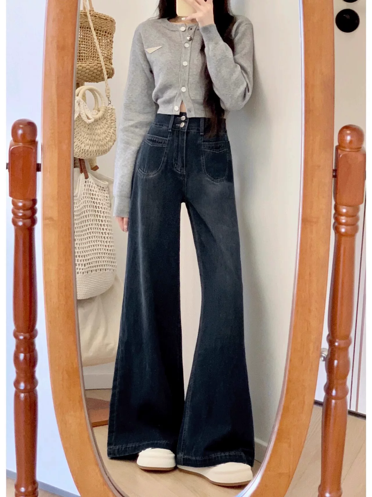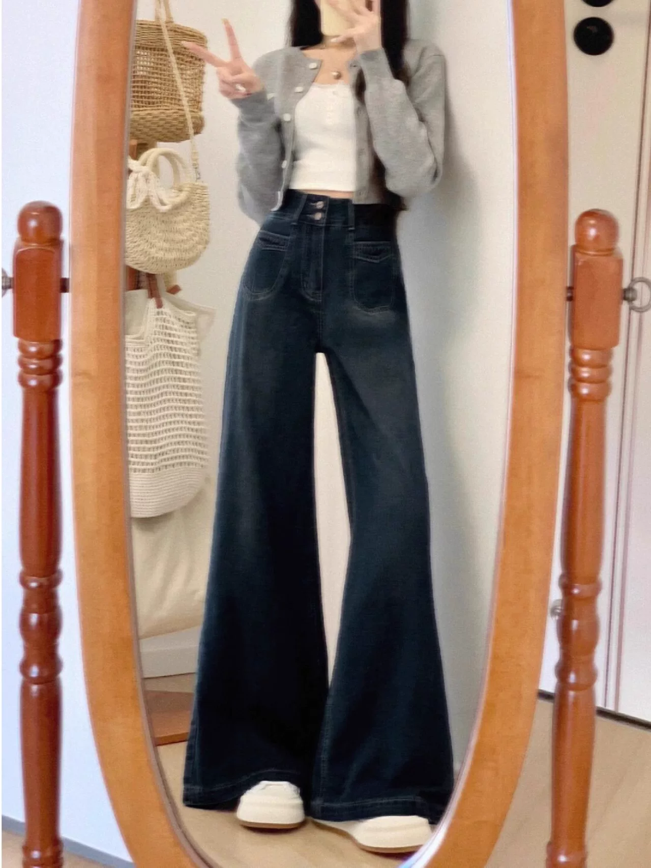 - Quần jeans ống đứng nữ thu đông 2025, size lớn, cạp cao, dáng rộng, tôn dáng, dành cho người có thân hình quả lê, quần ống rộng dài chấm đất