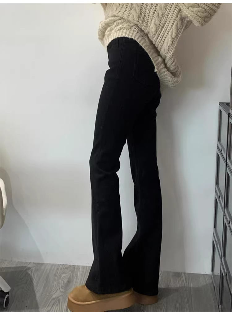 Quần jeans ống loe dày dặn lót lông cừu đen La Chapelle dành cho nữ, mẫu mới thu đông 2025, chất liệu co giãn, không bó sát.