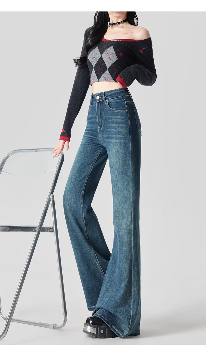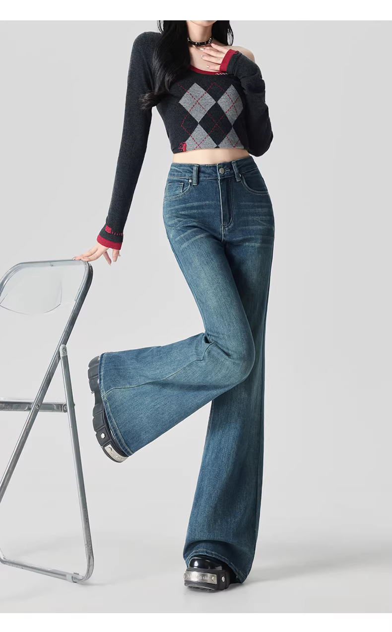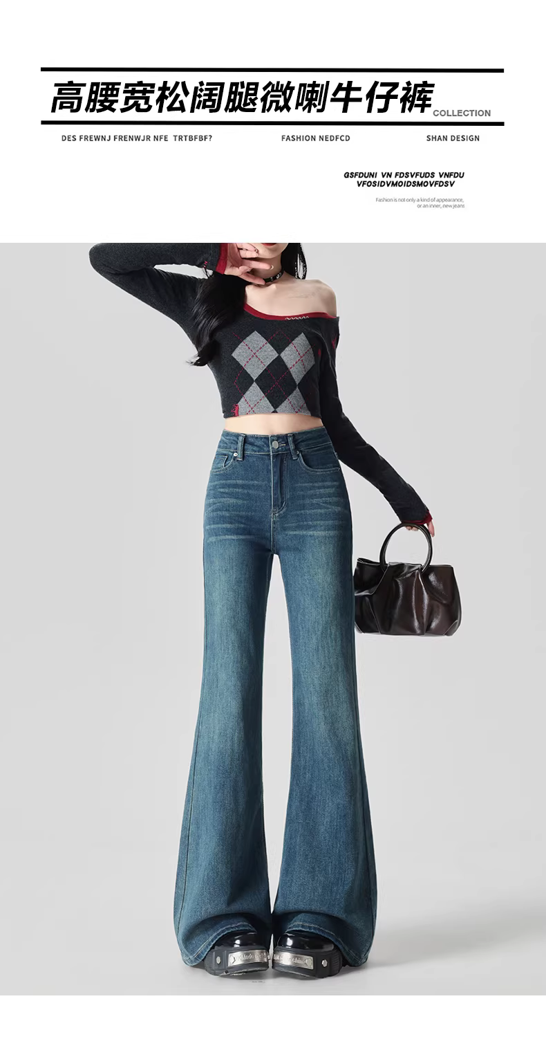 - Quần jeans ống loe dày dặn lót lông La Chapelle dành cho nữ, mẫu mới thu đông 2025, cạp cao, dáng rộng, tôn dáng