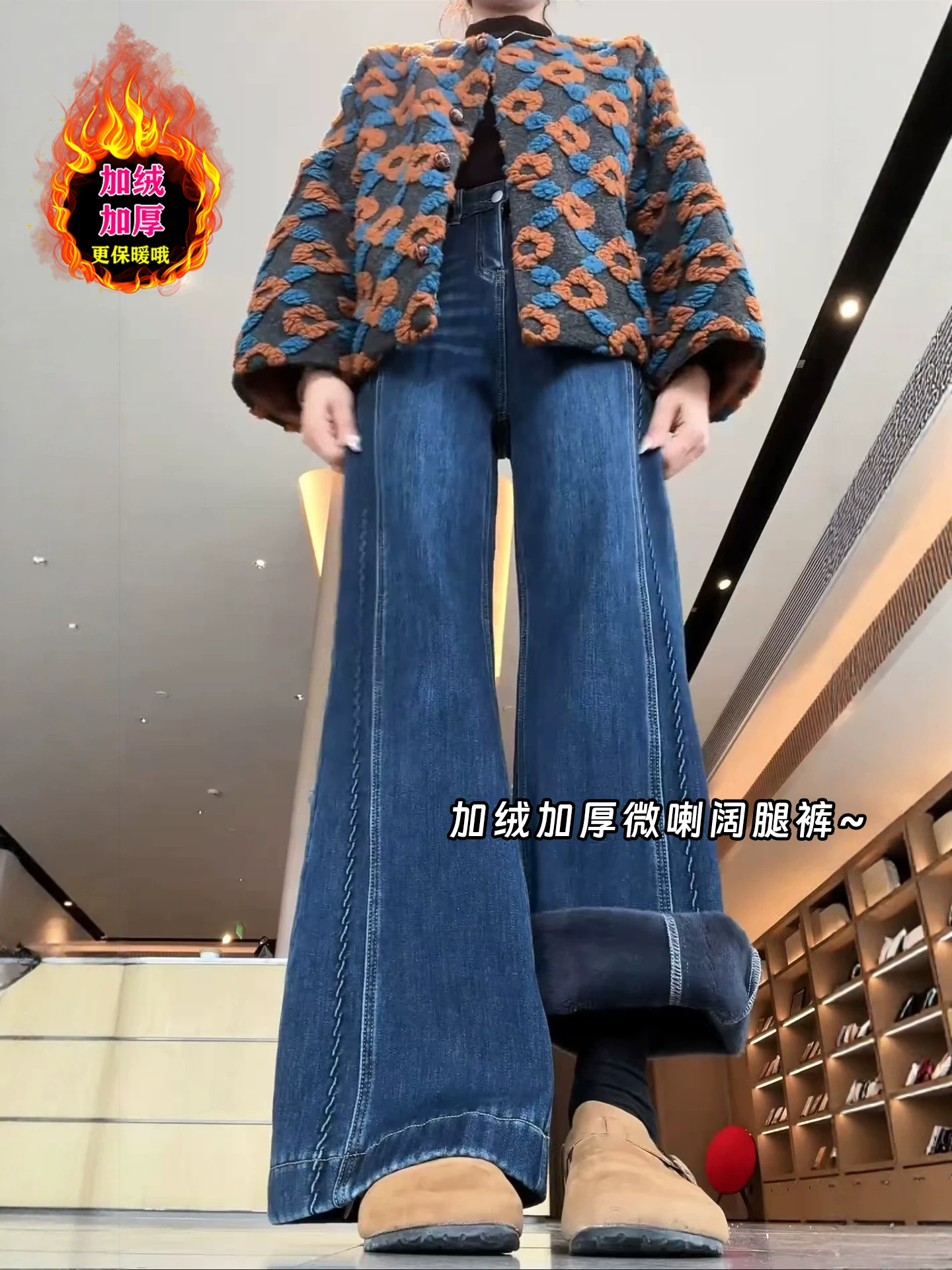 - Quần jeans ống loe dày lót lông cừu dành cho nữ mùa đông 2025, size lớn, cạp cao, dáng rộng, tôn dáng, ấm áp, ống chuông