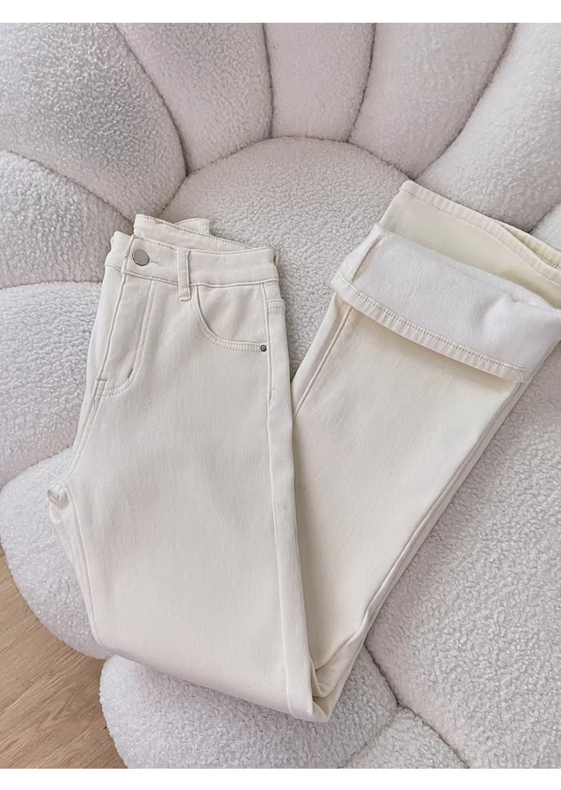 - Quần jeans ống loe lót lông trắng La Chapelle dành cho nữ, mẫu mới thu đông 2025, cạp cao, ôm dáng, kiểu chuông