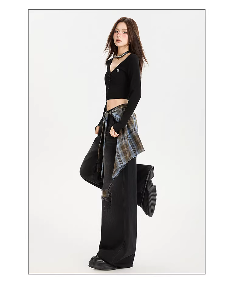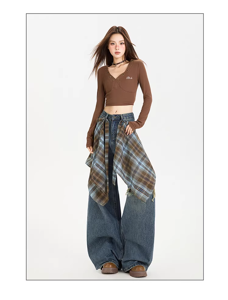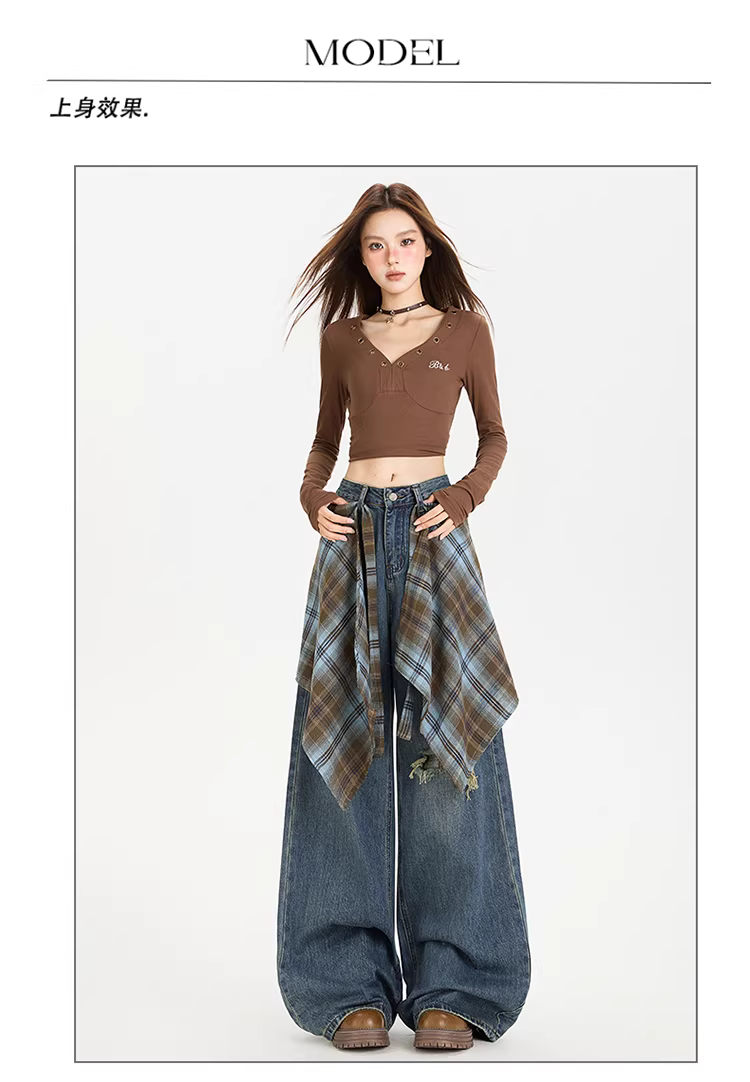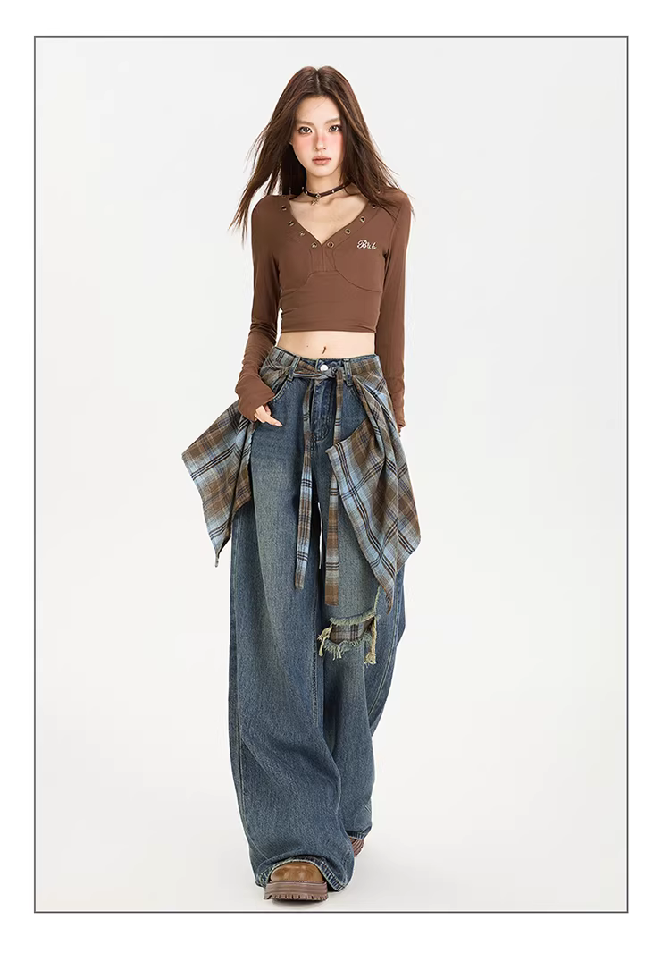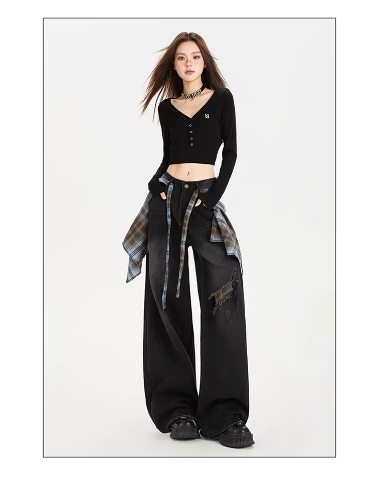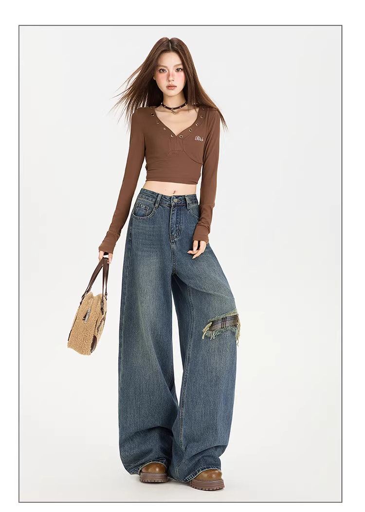 - Quần jeans ống rộng che mông La Chapelle dành cho nữ, mẫu mới thu 2025, cạp cao, giả rách, dáng rộng, ống thẳng