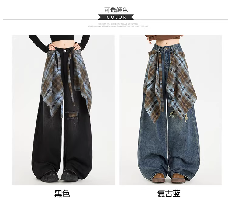 Quần jeans ống rộng che mông La Chapelle dành cho nữ, mẫu mới thu 2025, cạp cao, giả rách, dáng rộng, ống thẳng