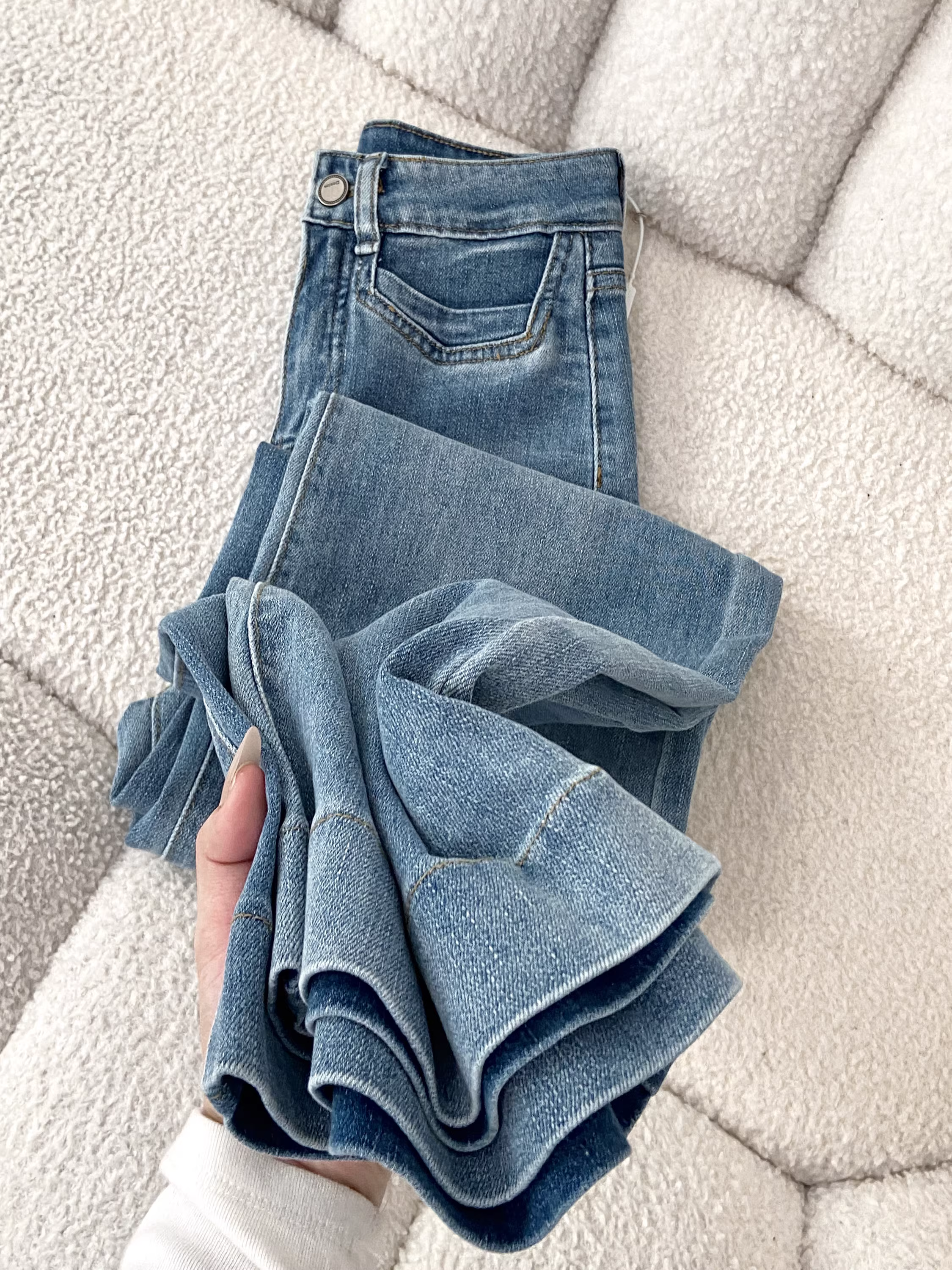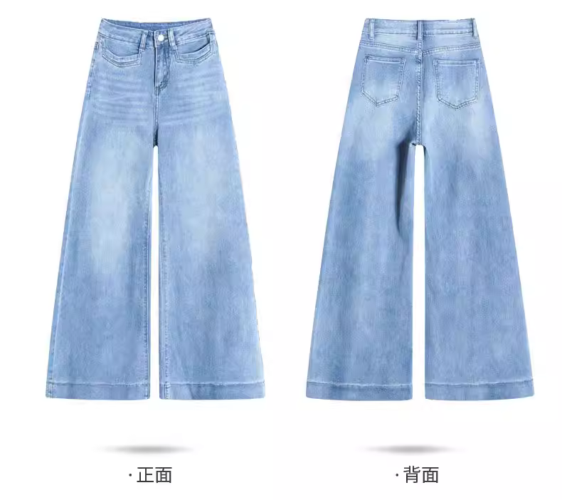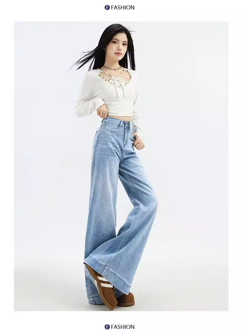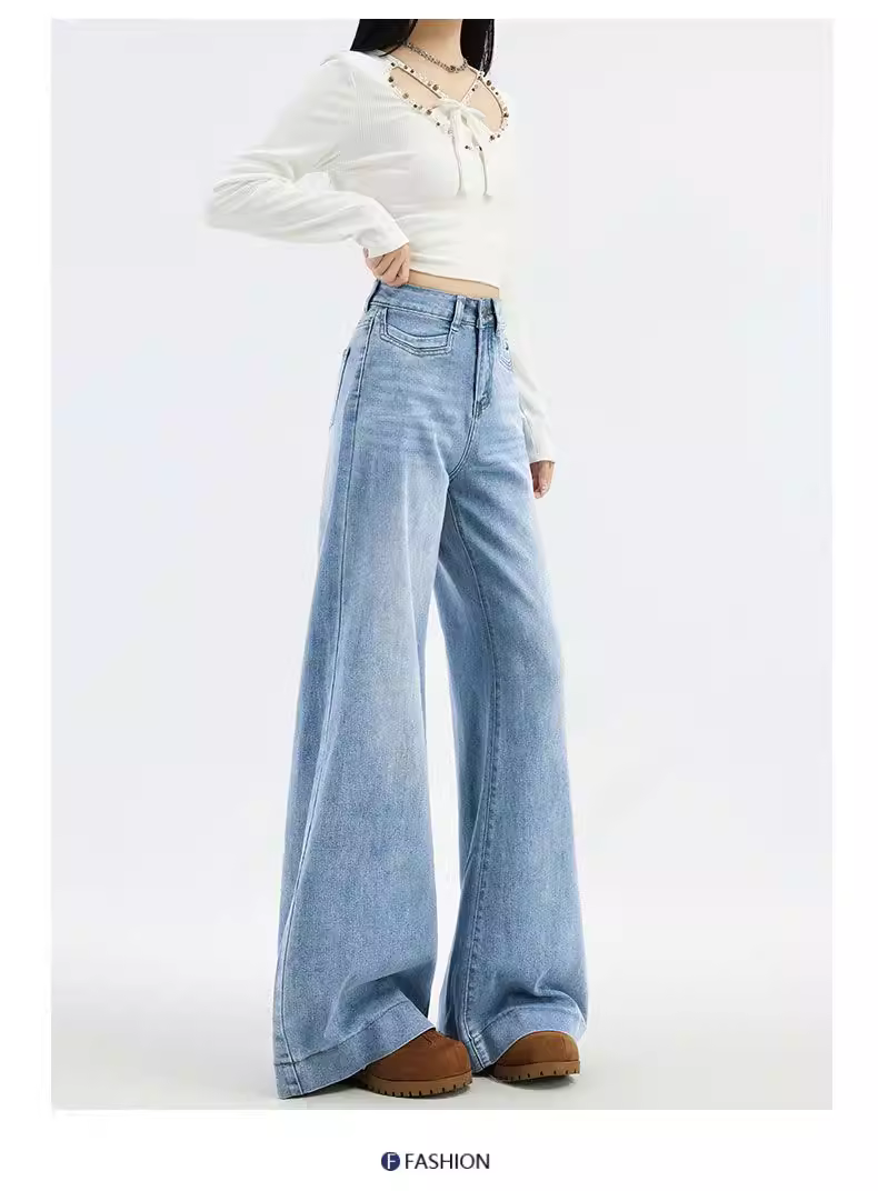 - Quần jeans ống rộng dài chấm đất màu sáng La Chapelle dành cho nữ, mẫu mới thu đông 2025, cạp cao, dáng rộng, chất liệu mềm mại, ống thẳng