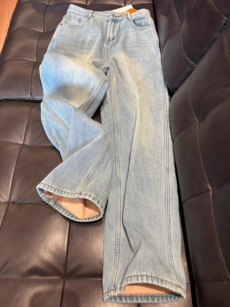 - Quần jeans ống rộng dáng suông dày dặn lót lông màu sáng La Chapelle dành cho nữ, mẫu mới thu đông 2025, cạp cao