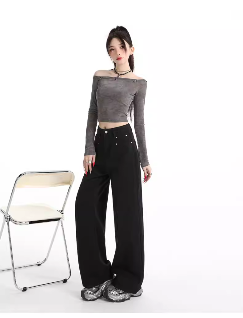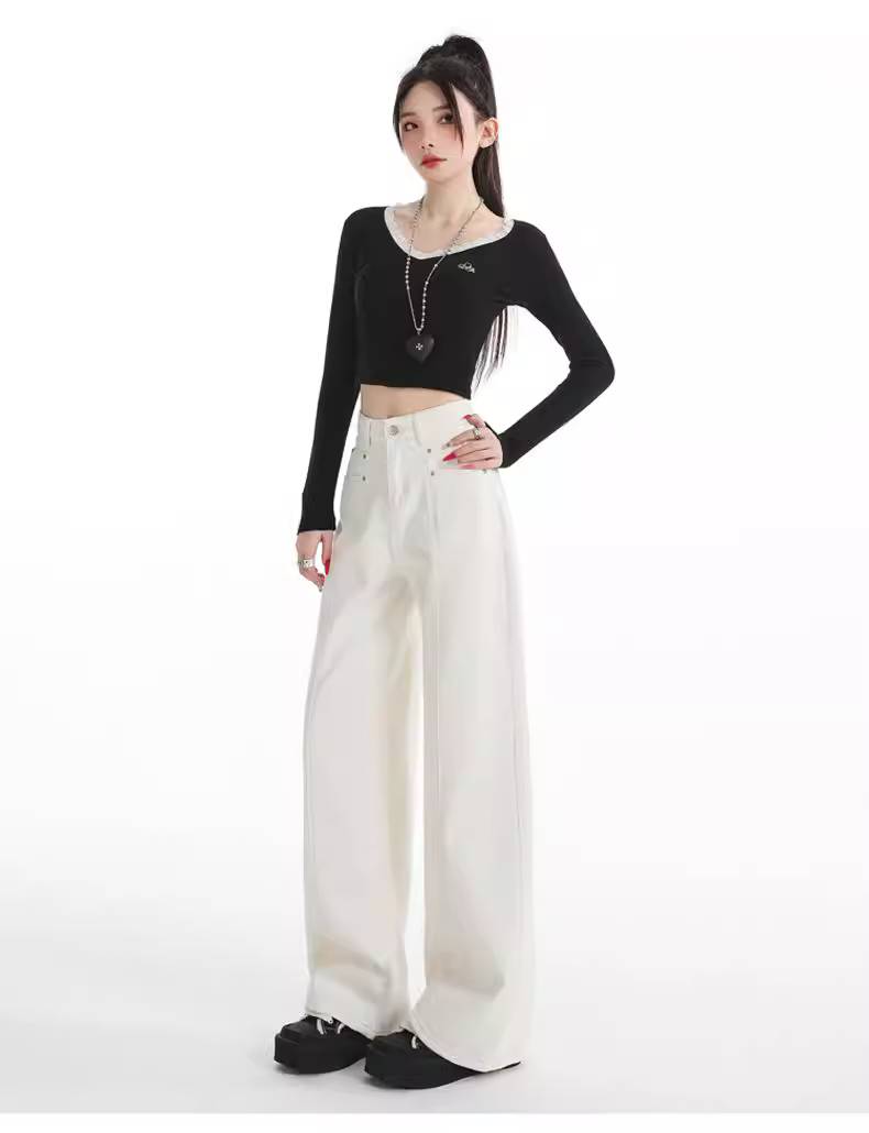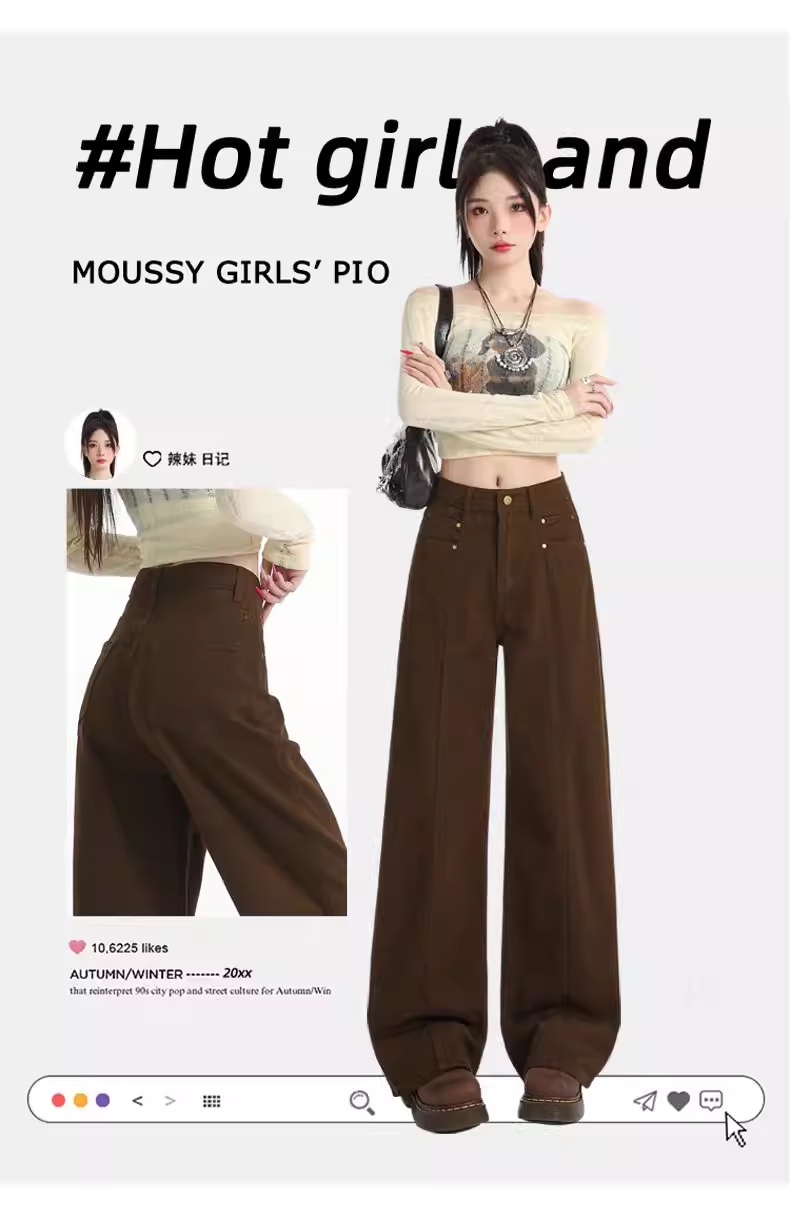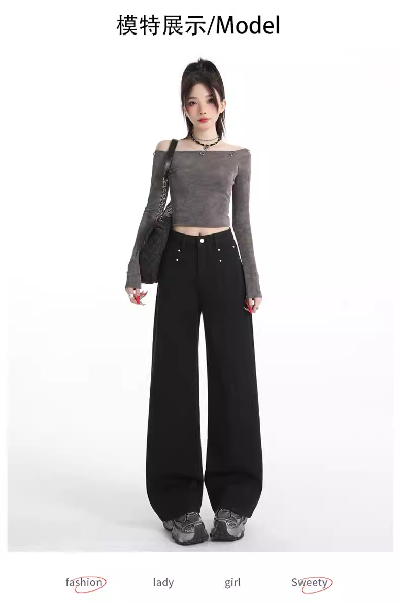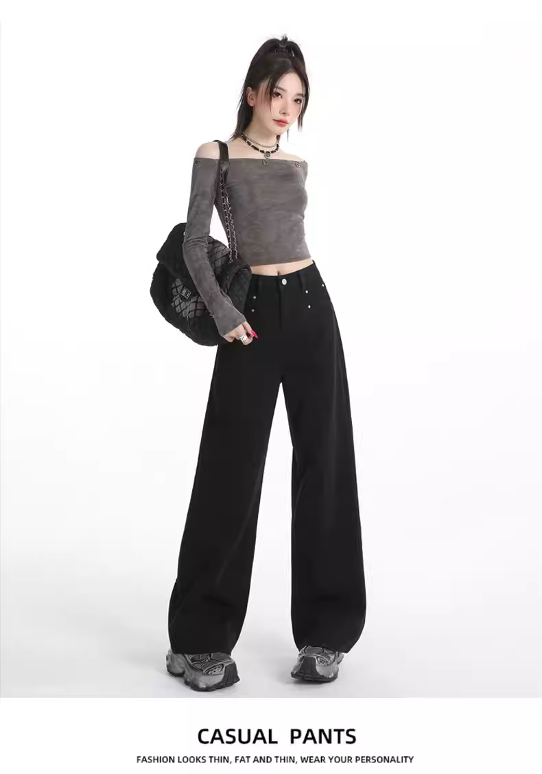 - Quần jeans ống rộng dày dặn lót lông cừu đen La Chapelle dành cho nữ, mẫu mới thu đông 2025, cạp cao, dáng rộng, thẳng
