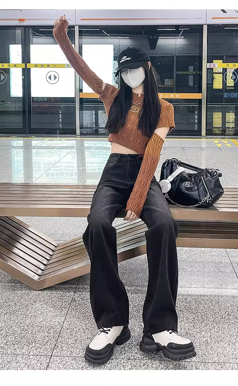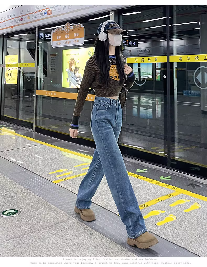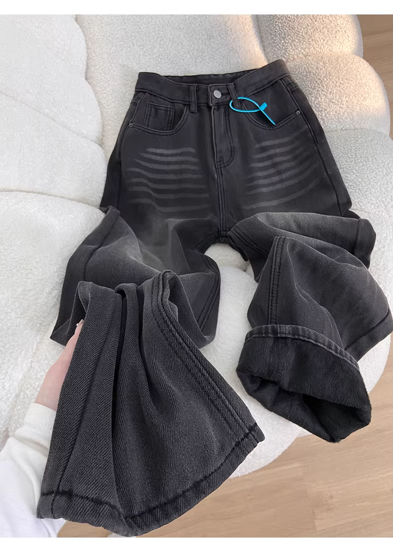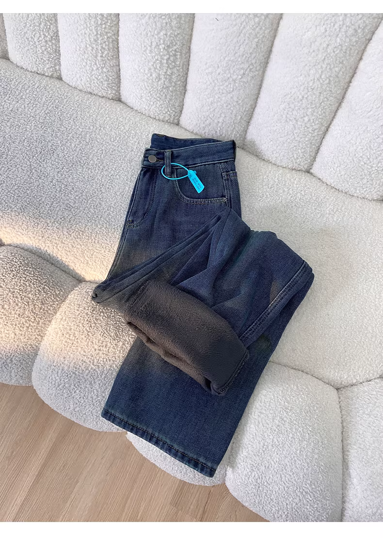 - Quần jeans ống rộng dày dặn lót lông La Chapelle dành cho nữ, mẫu mới thu đông 2025, cạp cao, dáng ôm thẳng