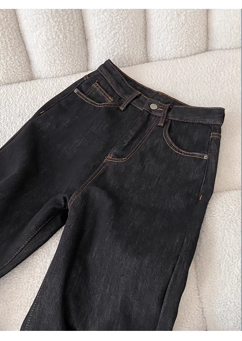 - Quần jeans ống rộng dày dặn lót lông màu cà phê La Chapelle dành cho nữ, mẫu mới thu đông 2025, cạp cao, dáng suôn.