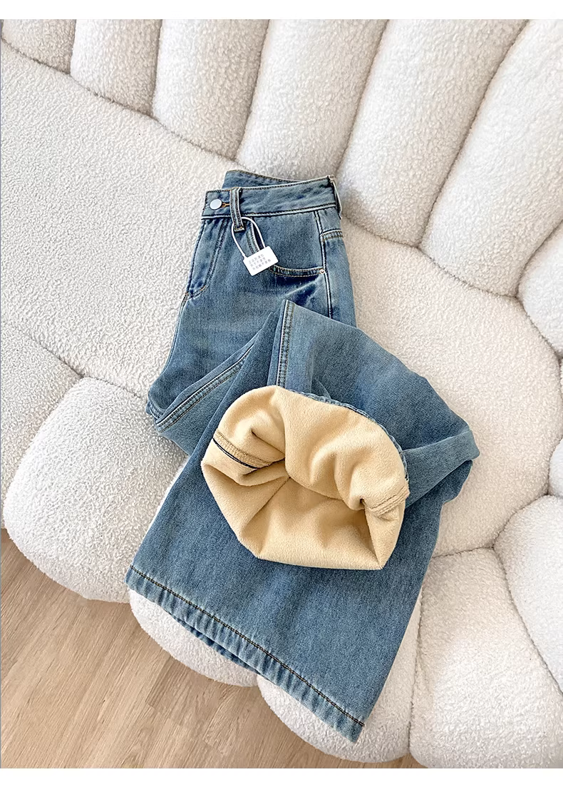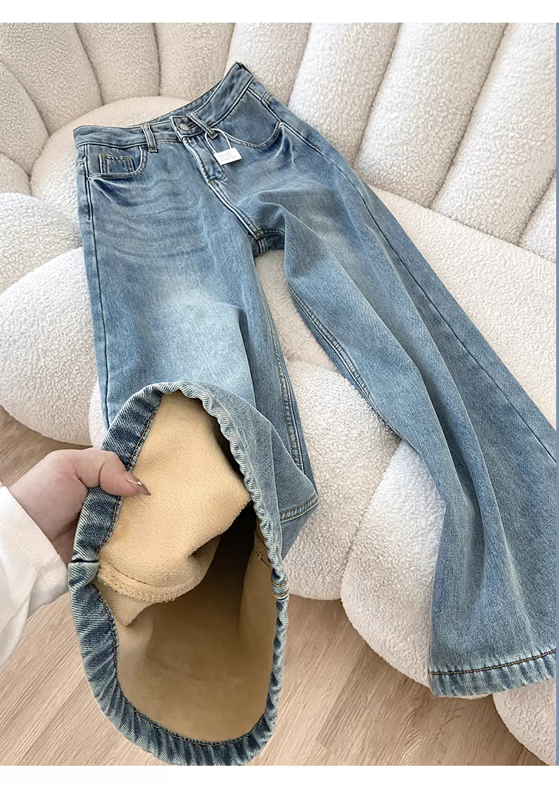 - Quần jeans ống rộng dày dặn lót lông màu sáng La Chapelle dành cho nữ, mùa thu đông 2025, kiểu dáng mới cạp cao, dáng thẳng, chất liệu mềm mại