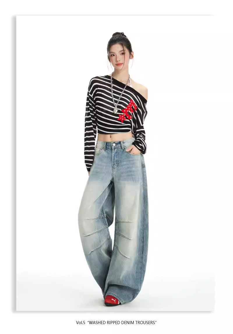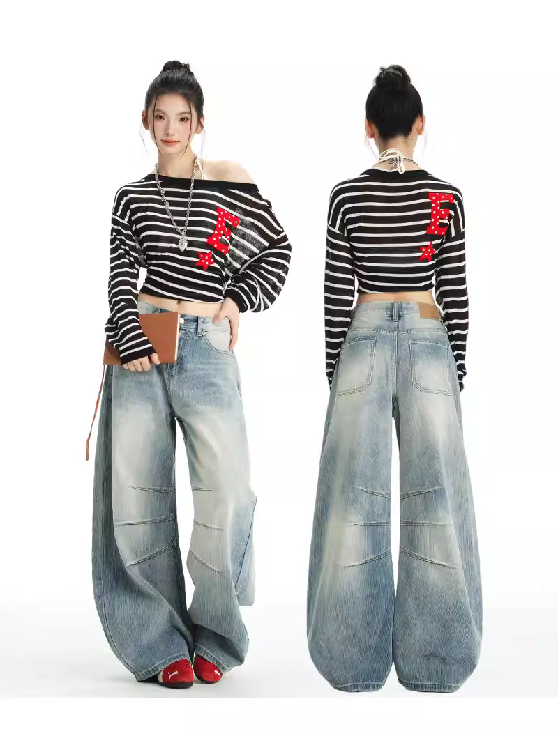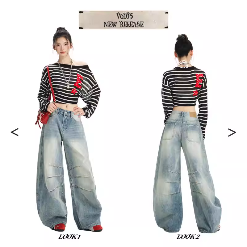 - Quần jeans ống rộng họa tiết tre màu sáng La Chapelle dành cho nữ, mẫu mới thu đông 2025, cạp cao, dáng thẳng, size nhỏ nhắn