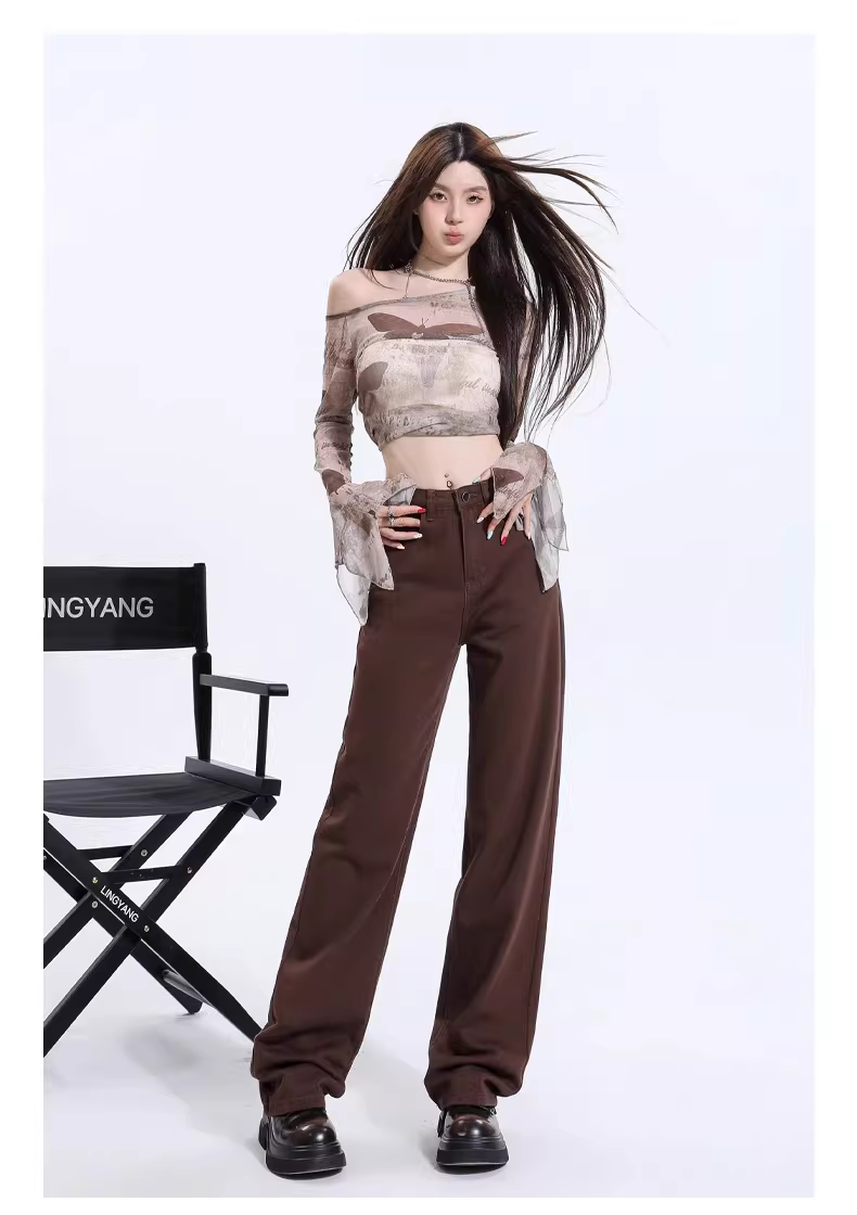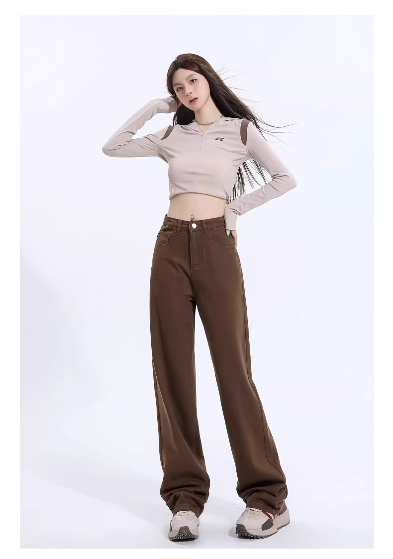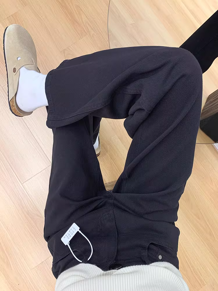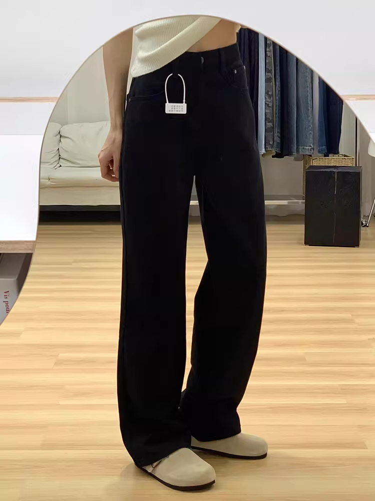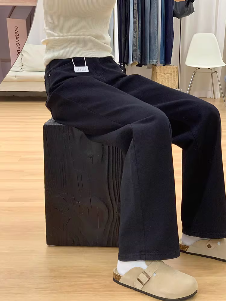 Quần jeans ống rộng lót lông cừu đen La Chapelle dành cho nữ, thu đông 2025, kiểu dáng mới, cạp cao, tôn dáng, thẳng.