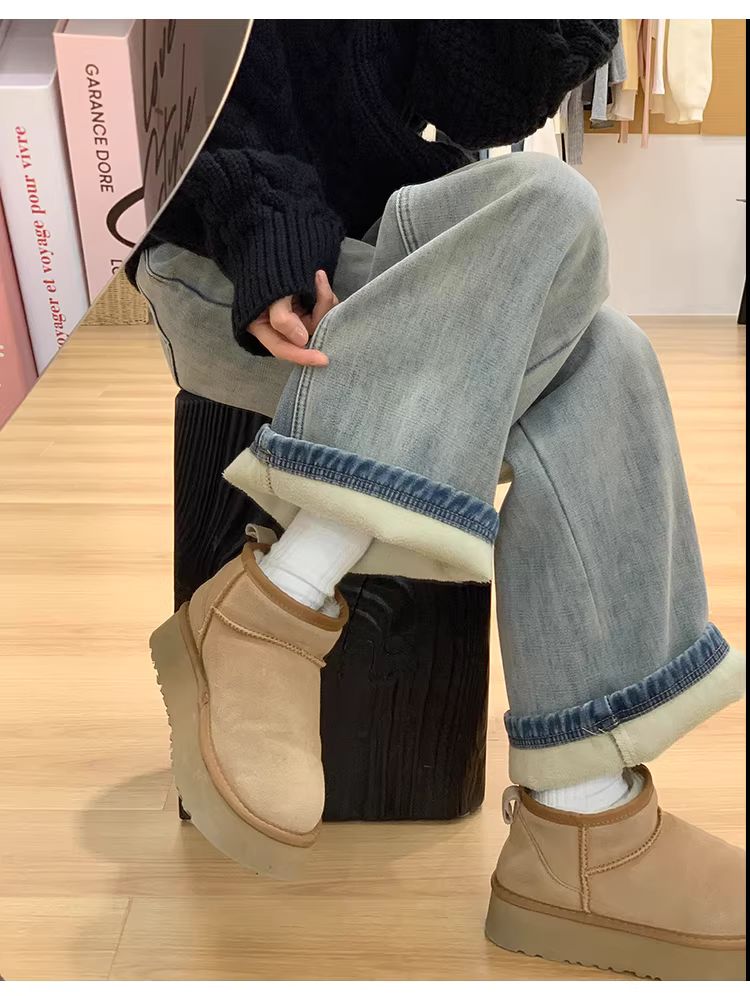 Quần jeans ống rộng lót lông cừu La Chapelle kiểu vintage dành cho nữ, mẫu mới thu đông 2025, cạp cao, dáng rộng, suôn thẳng