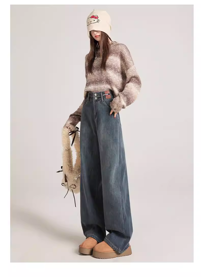 - Quần jeans ống rộng lót lông dày kiểu La Chapelle dành cho nữ, mẫu mới thu đông 2025, dáng nhỏ nhắn, cạp cao, ống thẳng