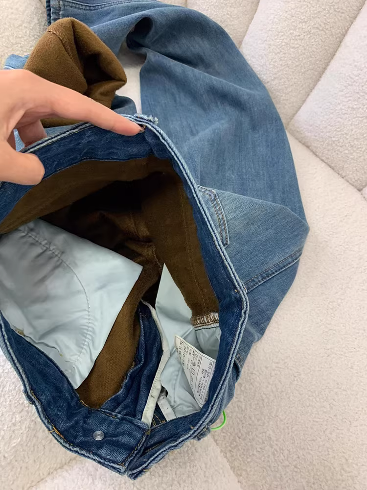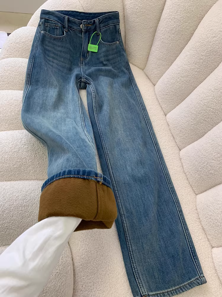 - Quần jeans ống rộng lót lông La Chapelle dành cho nữ, thu đông 2025, kiểu mới, cạp cao, dáng rộng, chất dày, ống thẳng
