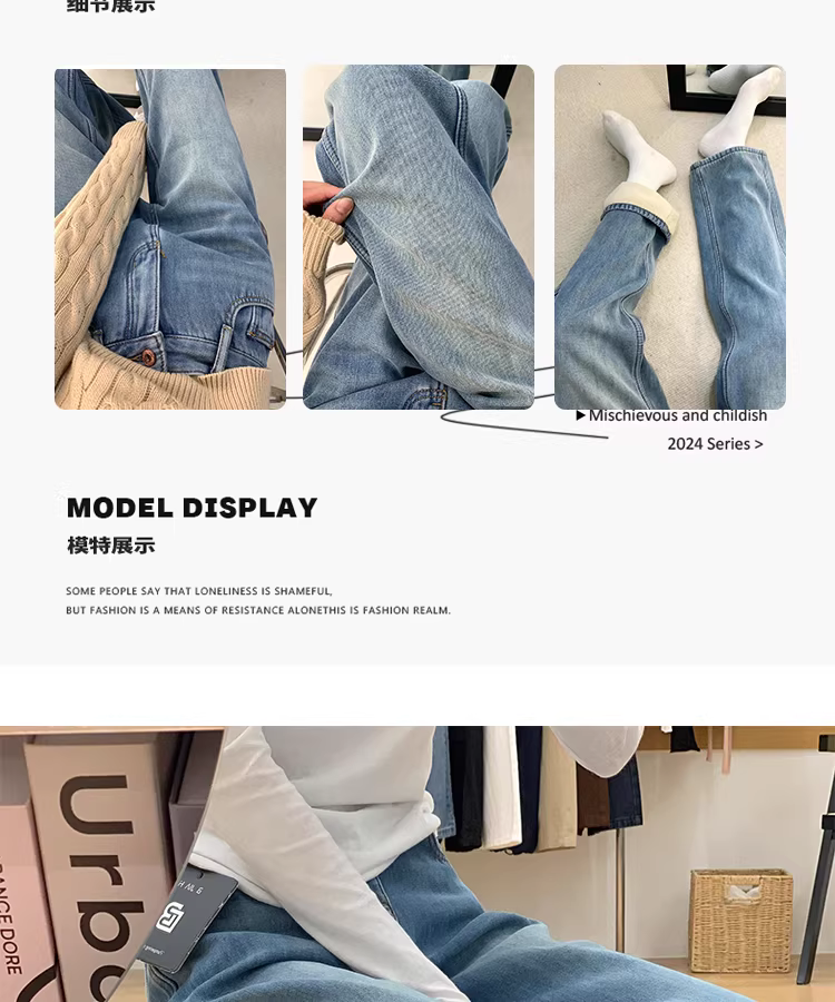 - Quần jeans ống rộng lót lông màu sáng La Chapelle dành cho nữ, mùa thu đông 2025, kiểu dáng mới, cạp cao, rộng rãi, thẳng.