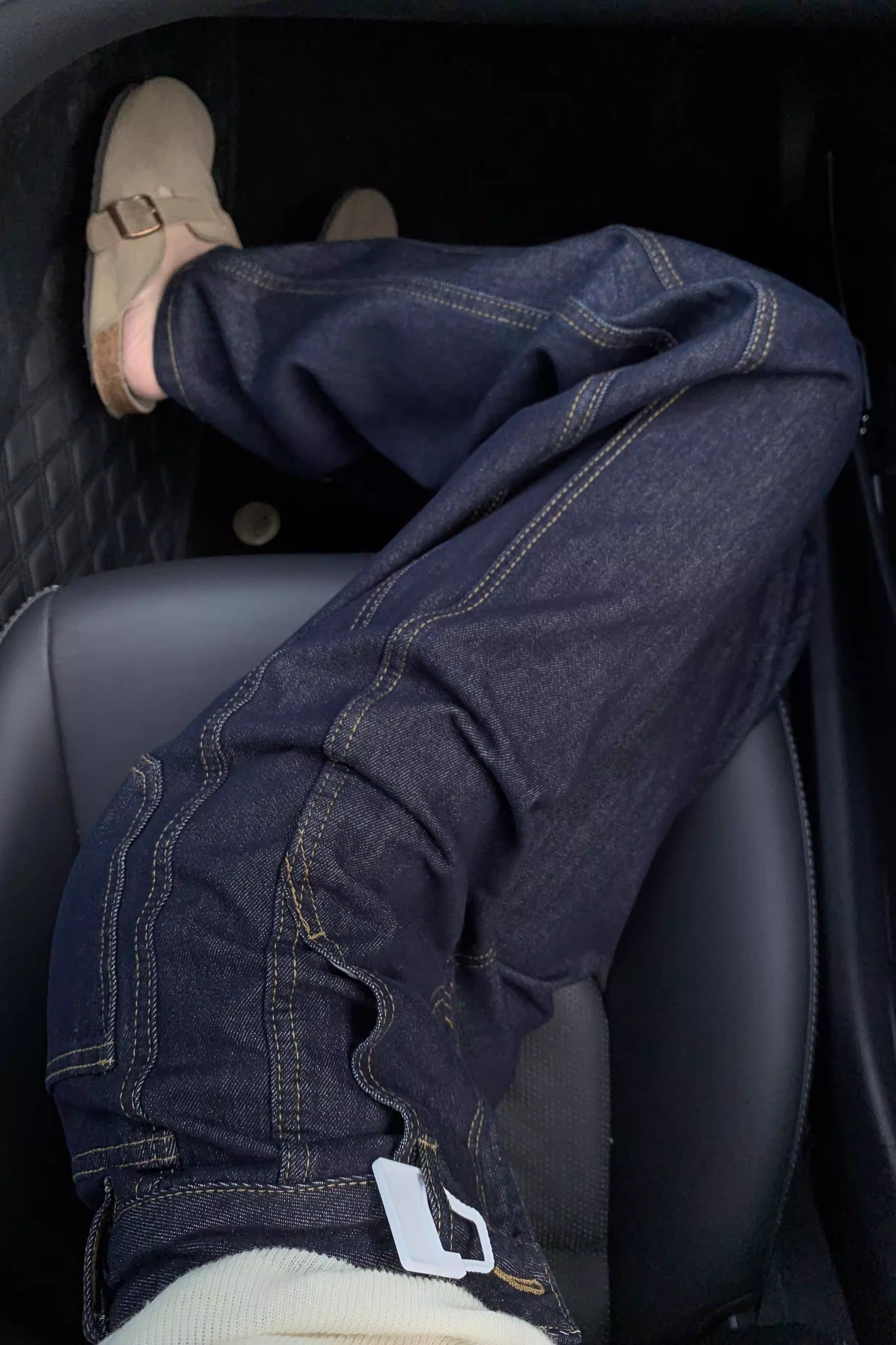 - Quần jeans ống rộng lót lông màu xanh đậm La Chapelle dành cho nữ, mẫu mới thu đông 2025, dáng rộng, cạp cao, dài chấm đất, kiểu thẳng
