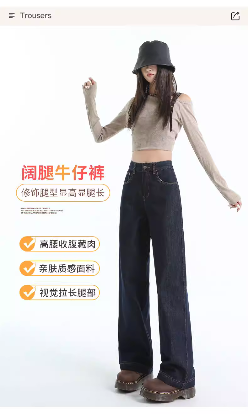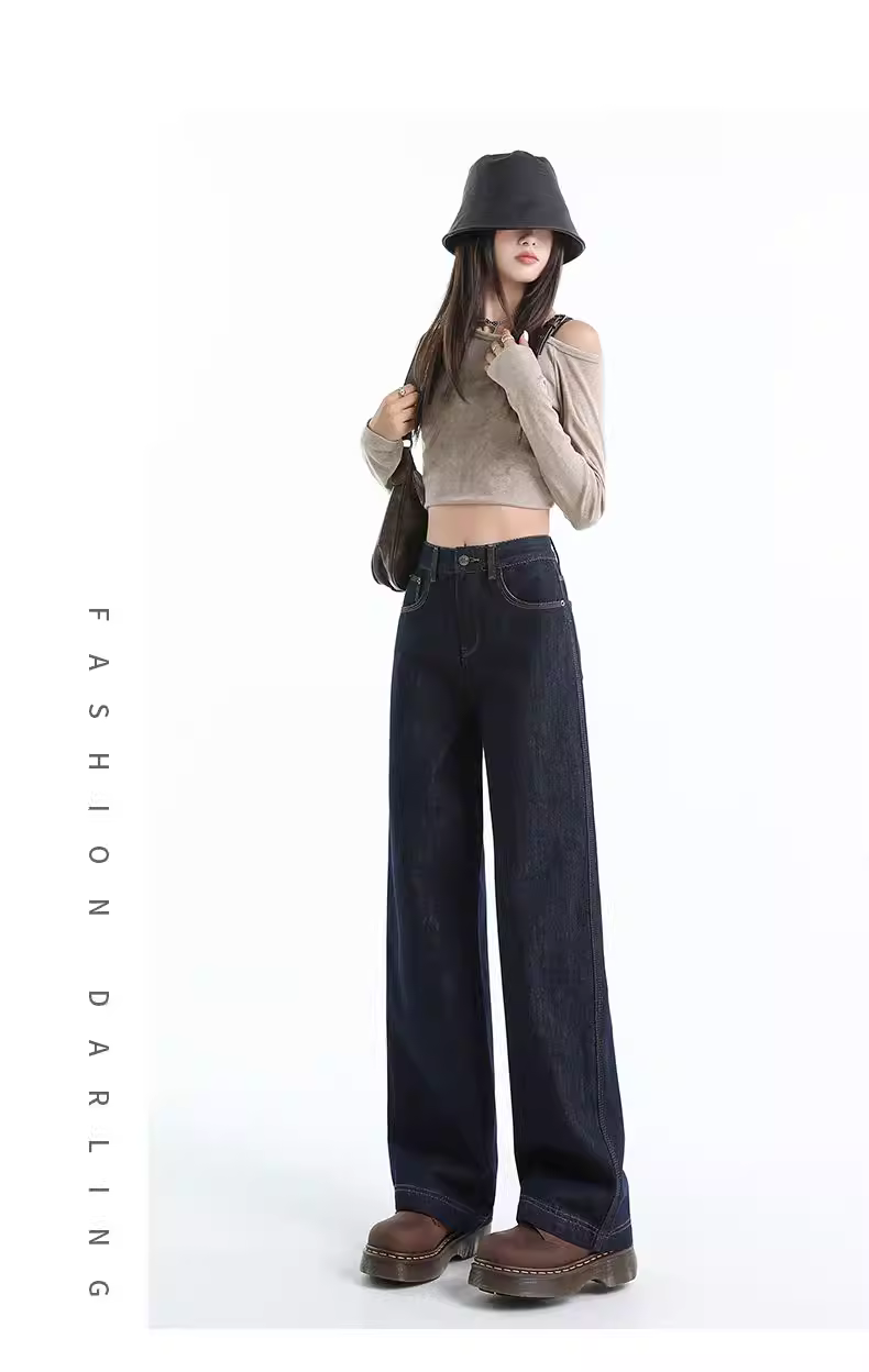 Quần jeans ống rộng lót lông màu xanh đậm La Chapelle dành cho nữ, mùa thu đông 2025, kiểu dáng mới, cạp cao, dáng thẳng, size nhỏ