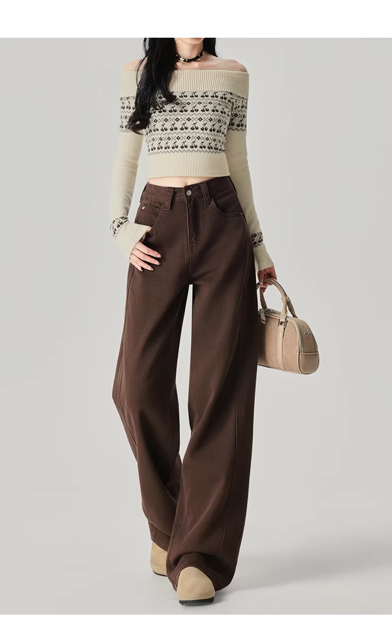 - Quần jeans ống rộng màu cà phê La Chapelle dành cho nữ, kiểu dáng suông rộng, cạp cao, mới mùa thu đông 2025