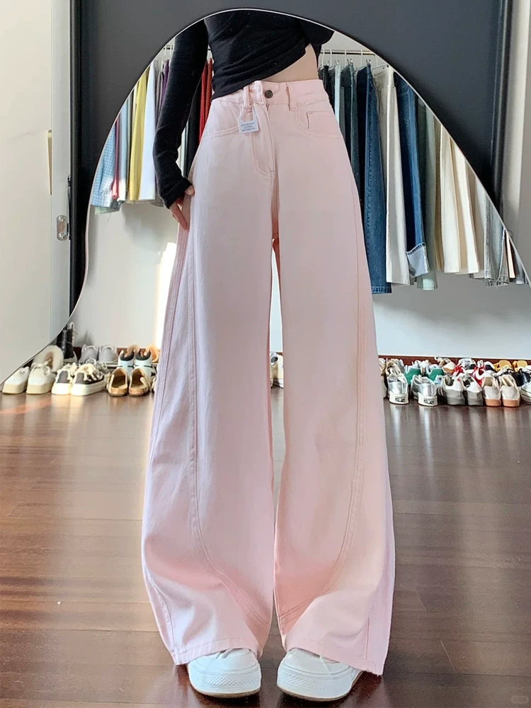- Quần jeans ống rộng màu hồng dành cho nữ mùa hè 2025, size lớn, cạp cao, dáng rộng, suôn mềm, tôn dáng, kiểu dáng thẳng