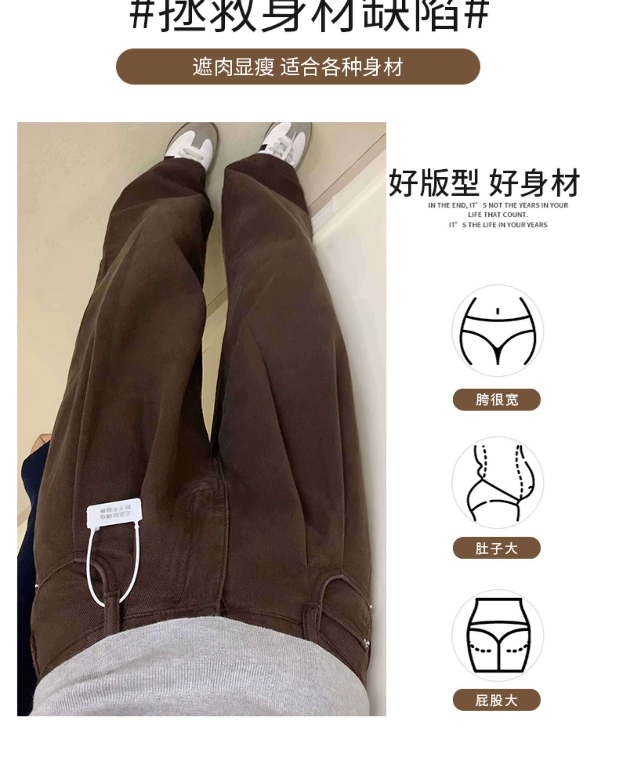 Quần jeans ống rộng màu nâu cà phê cổ điển dành cho nữ, kiểu thu đông 2025, size lớn, dành cho người mũm mĩm, cạp cao, dáng rộng, tôn dáng, ống thẳng