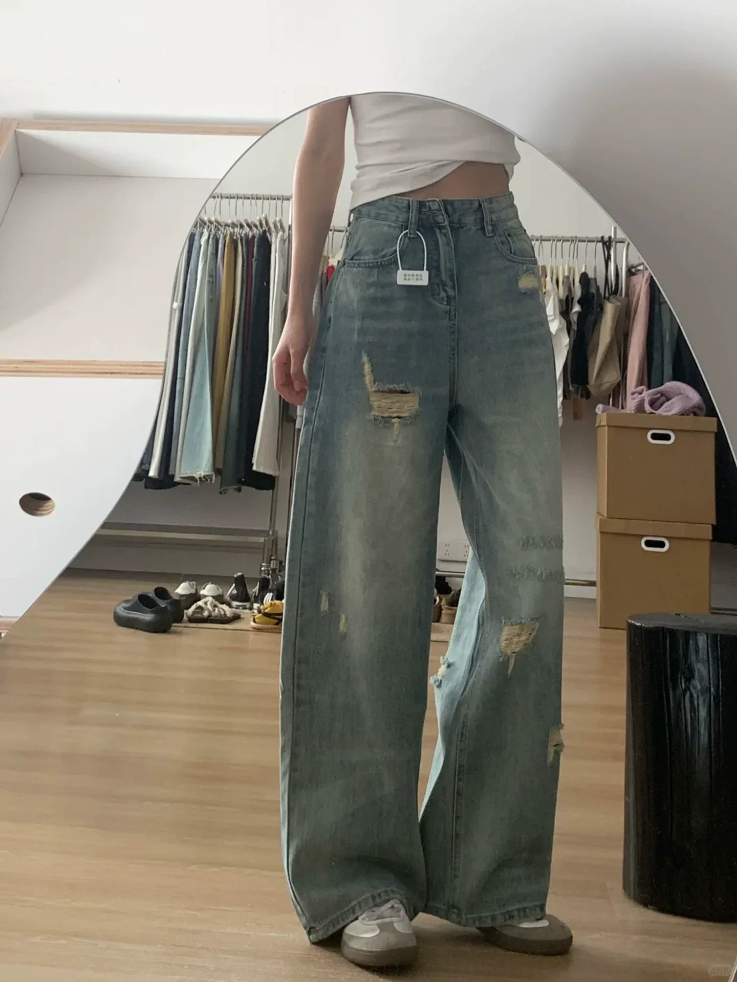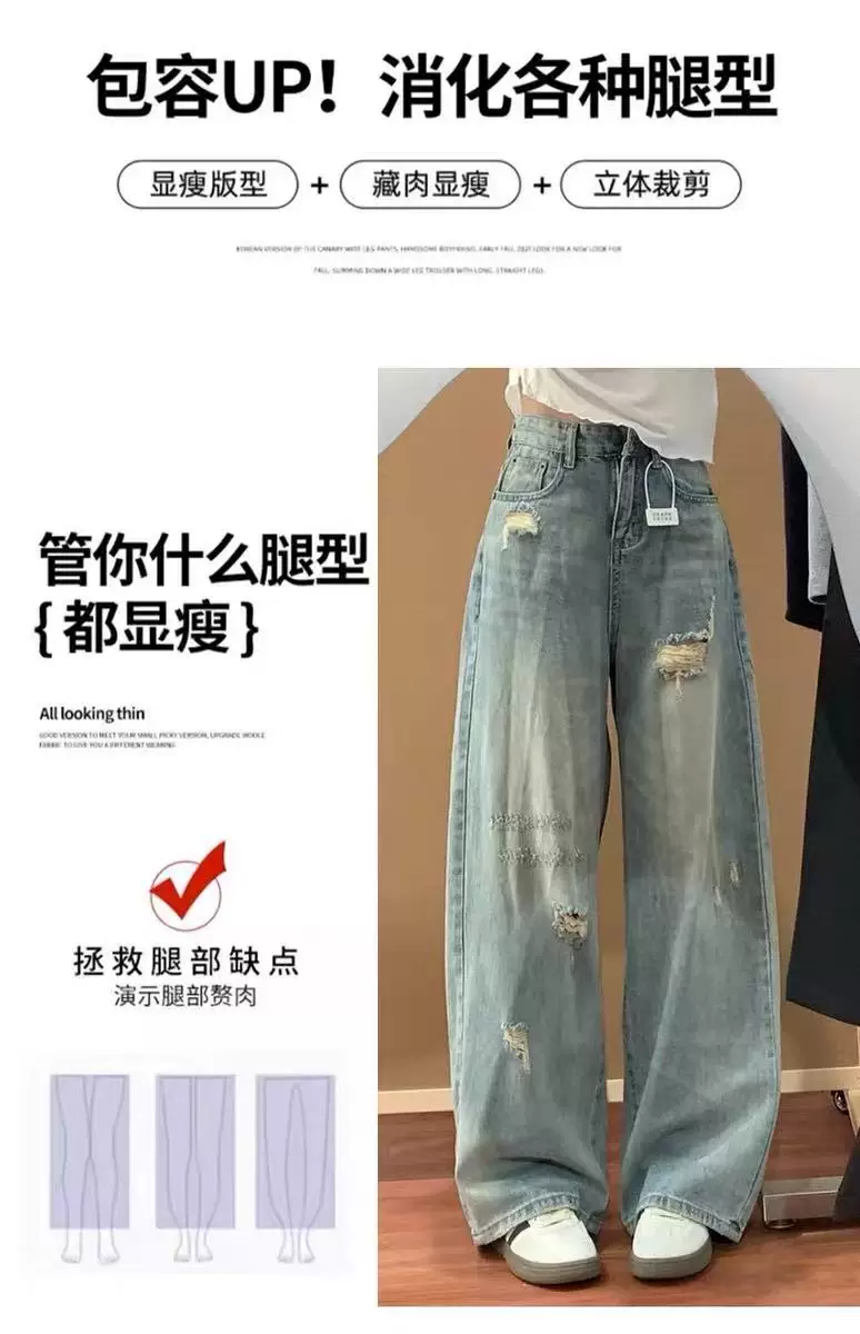 - Quần jeans rách nữ, kiểu dáng mỏng mùa hè, size lớn, cạp cao, che bụng, tôn dáng, dành cho người có dáng quả lê, quần ống rộng thẳng