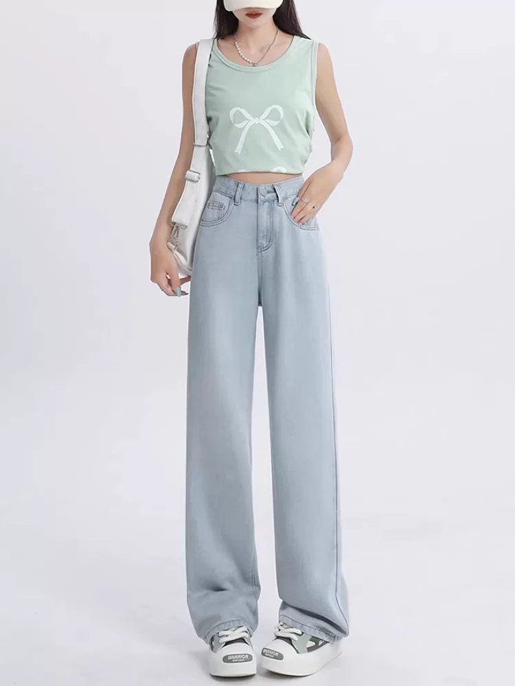 Quần jeans thẳng màu xanh nhạt chất liệu Tencel dành cho nữ, mùa hè 2025, size lớn, cạp cao, rộng rãi, mềm mại, tôn dáng, quần ống rộng