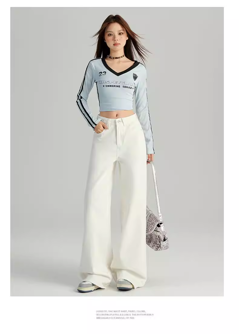 Quần jeans trắng La Chapelle ống rộng dành cho nữ, mẫu mới thu 2025, dáng nhỏ nhắn, cạp cao, rộng rãi, dài chấm đất, kiểu thẳng