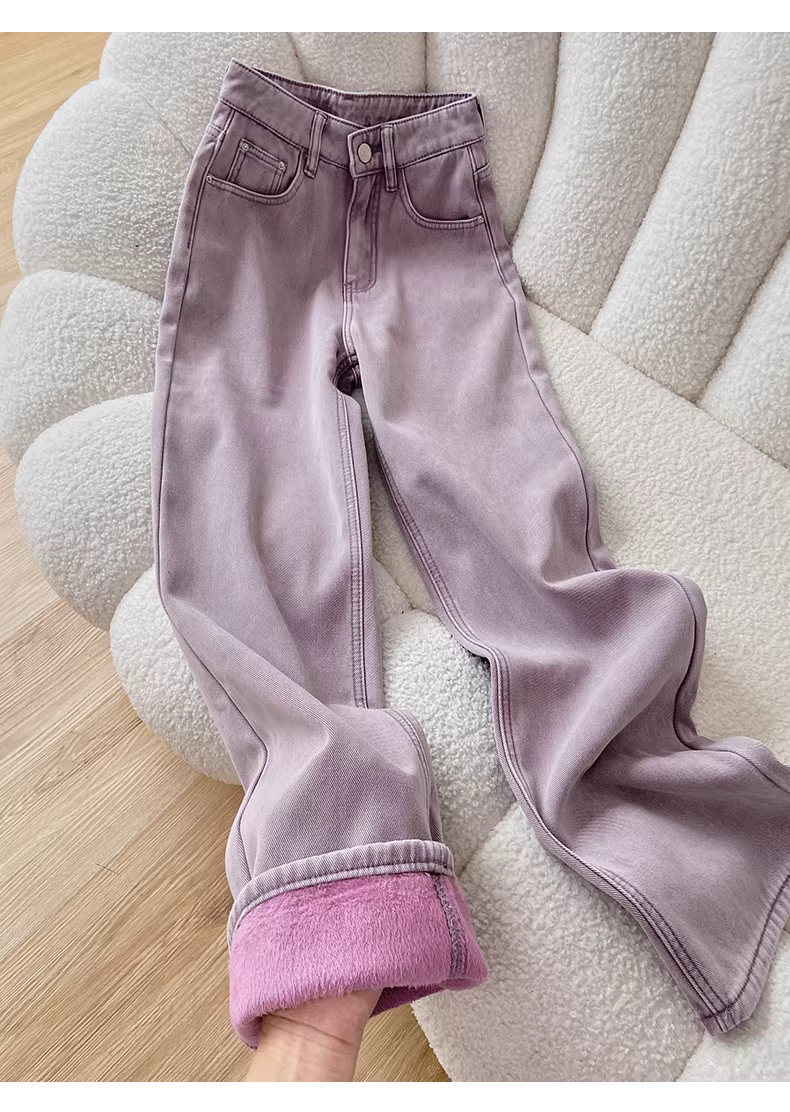 - Quần jeans trắng rộng ống rộng La Chapelle dành cho nữ, mẫu mới thu đông 2025, lót lông, cạp cao, dáng thẳng, dài chạm sàn