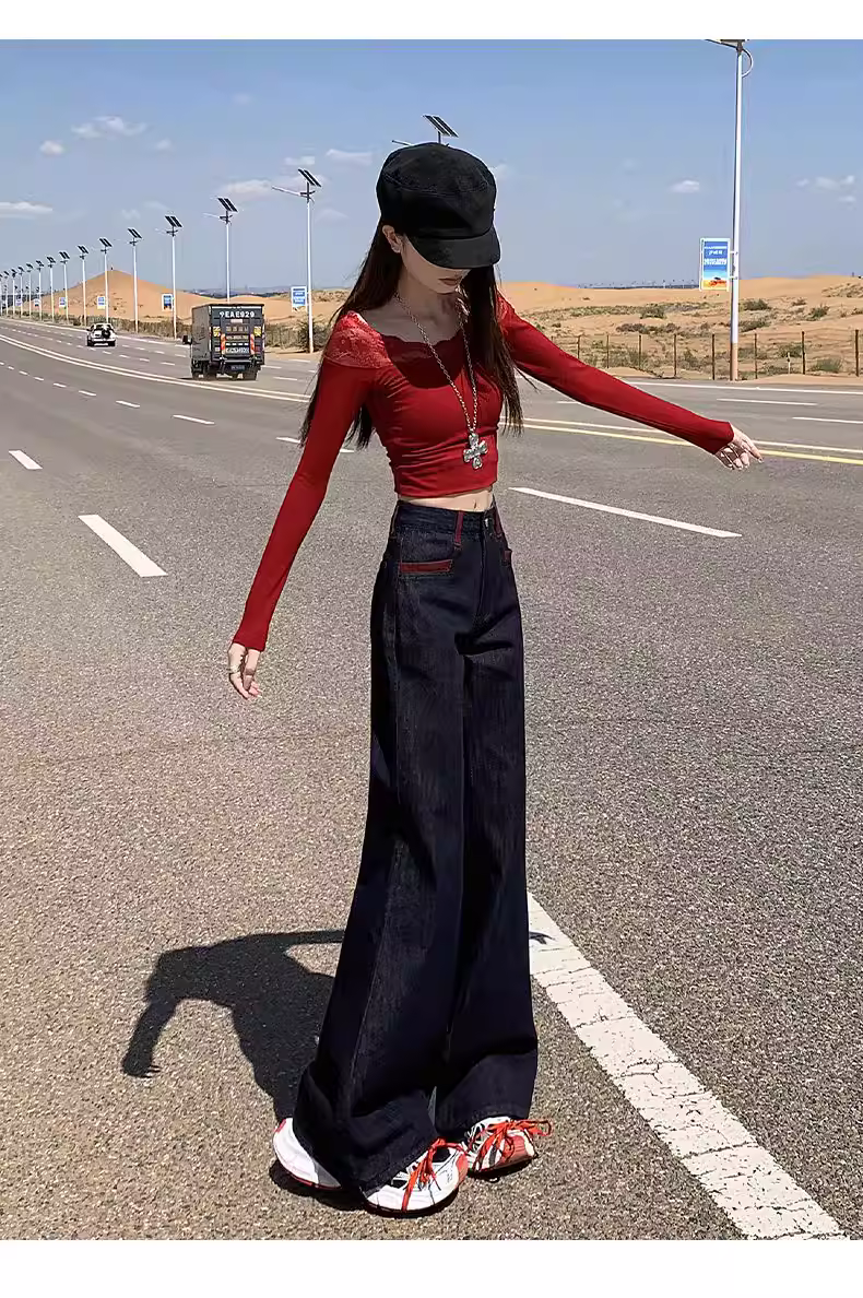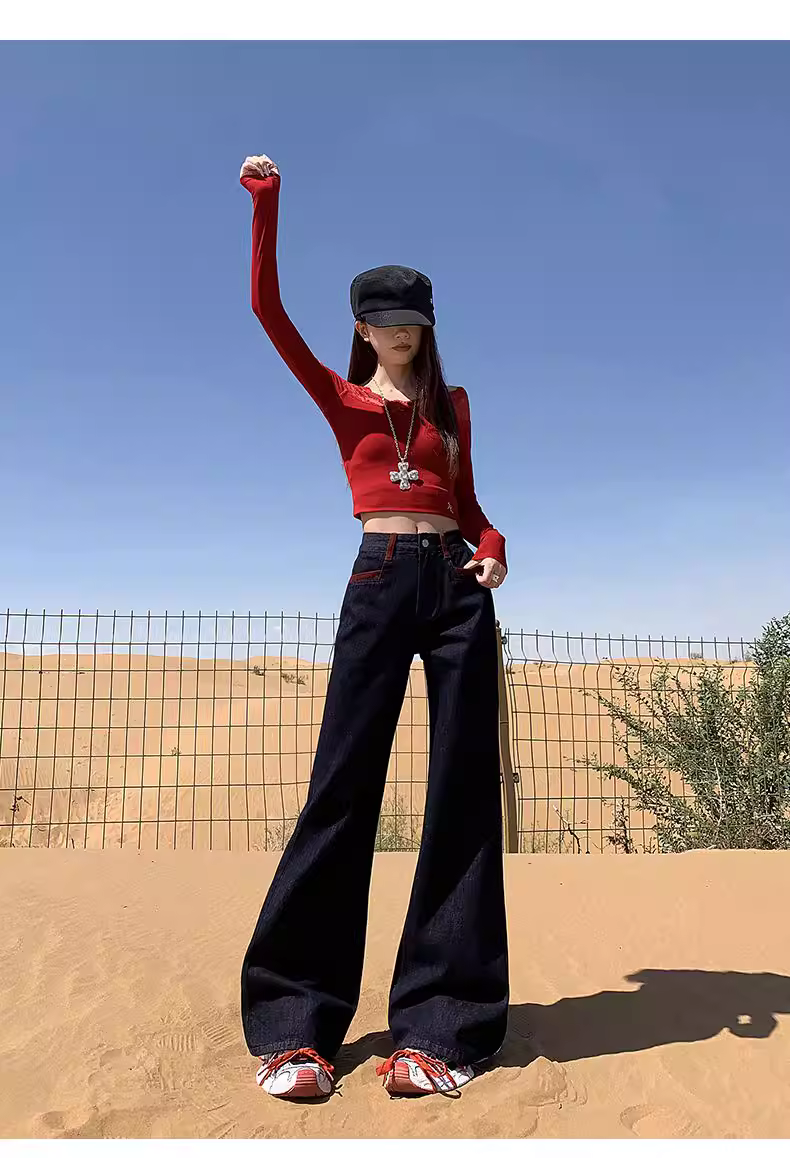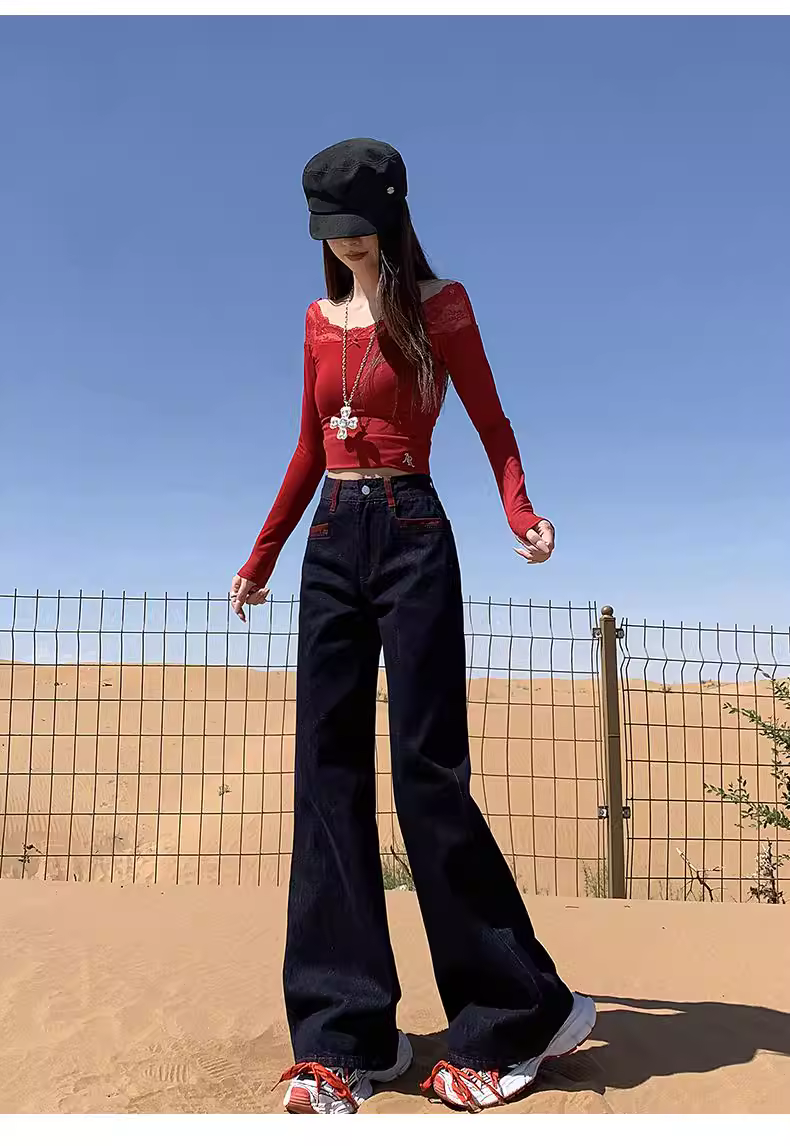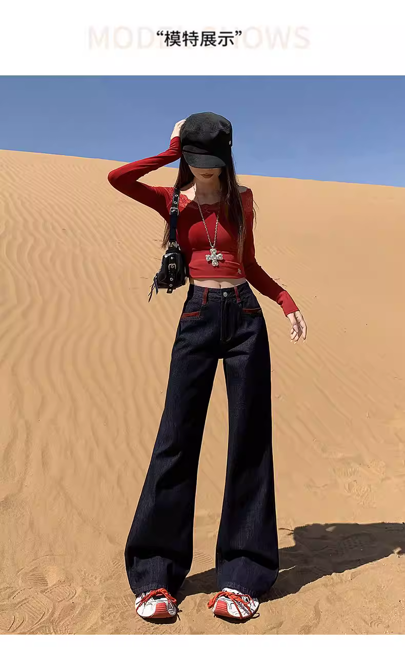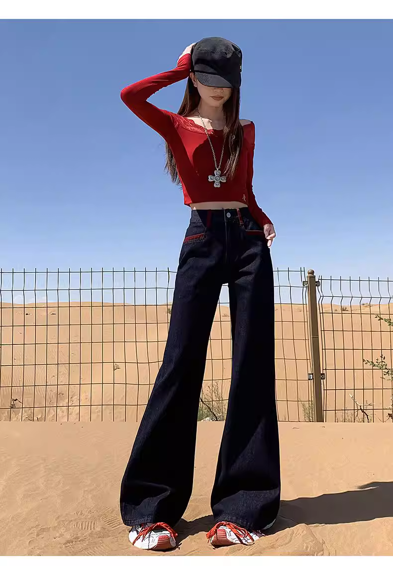 - Quần jeans xanh đậm dáng loe La Chapelle dành cho nữ, mẫu mới thu đông 2025, cạp cao, ôm dáng, không bó sát.