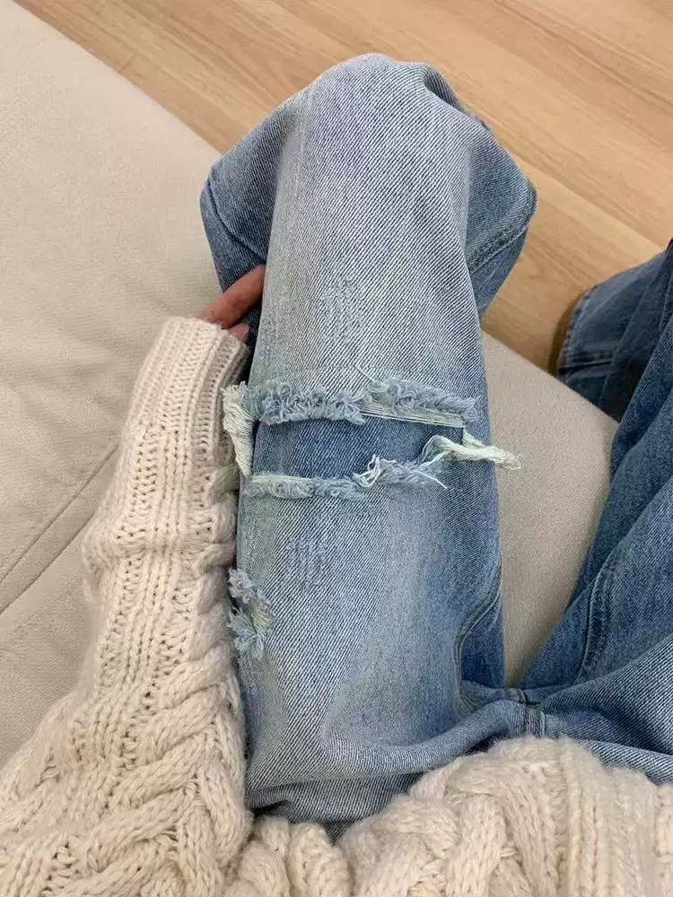 - Quần jeans xanh nhạt rách gối dáng rộng dành cho nữ xuân 2025, thiết kế size lớn, cạp cao, dáng suông, tôn dáng