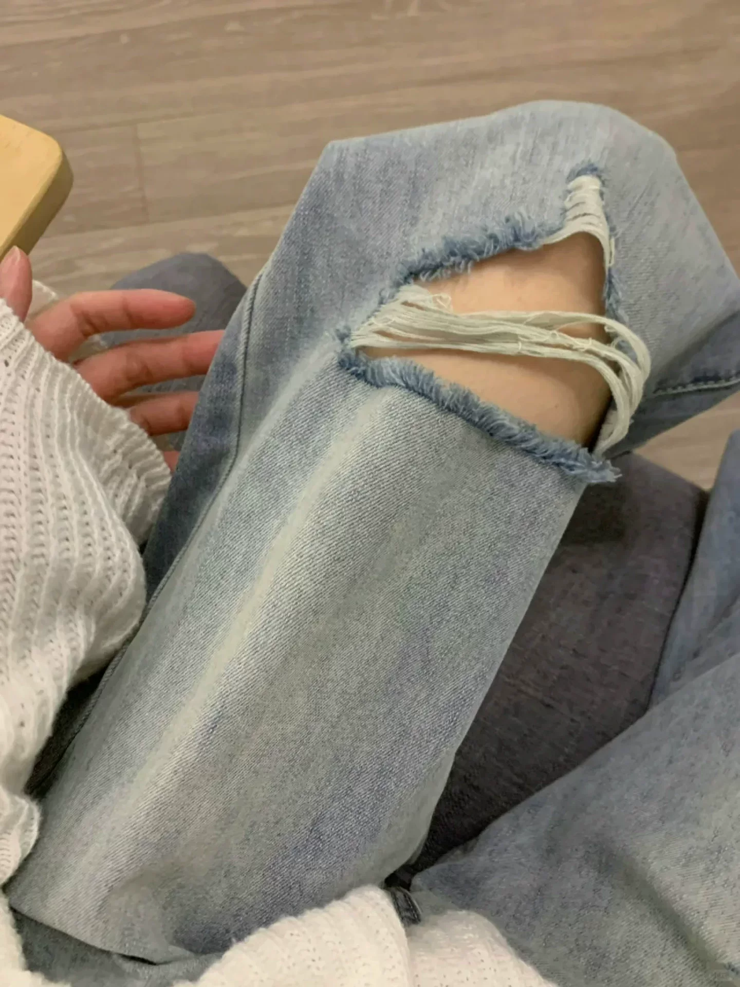 - Quần jeans xanh nhạt rách gối nữ, hè 2025, kiểu dáng mỏng, size lớn, cạp cao, dáng rộng, tôn dáng, dành cho người có thân hình quả lê, quần ống rộng