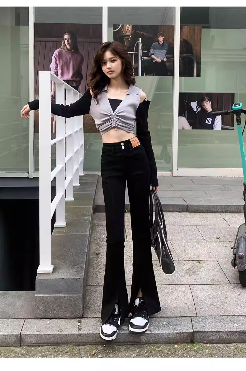 Quần jeans xẻ tà lót lông La Chapelle dành cho nữ, mẫu mới thu đông 2025, cạp cao, tôn dáng, không bó sát.