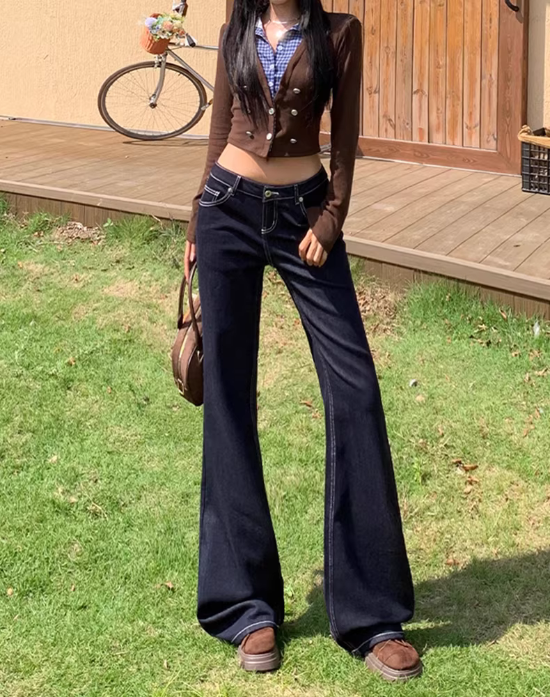 - Quần jeans xòe màu xanh đậm La Chapelle dành cho nữ, kiểu dáng ôm sát, cạp cao, dáng chuông, mới thu đông 2025
