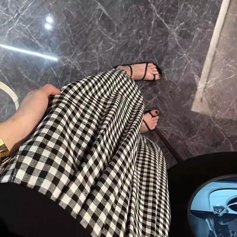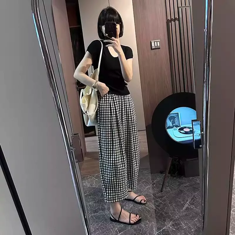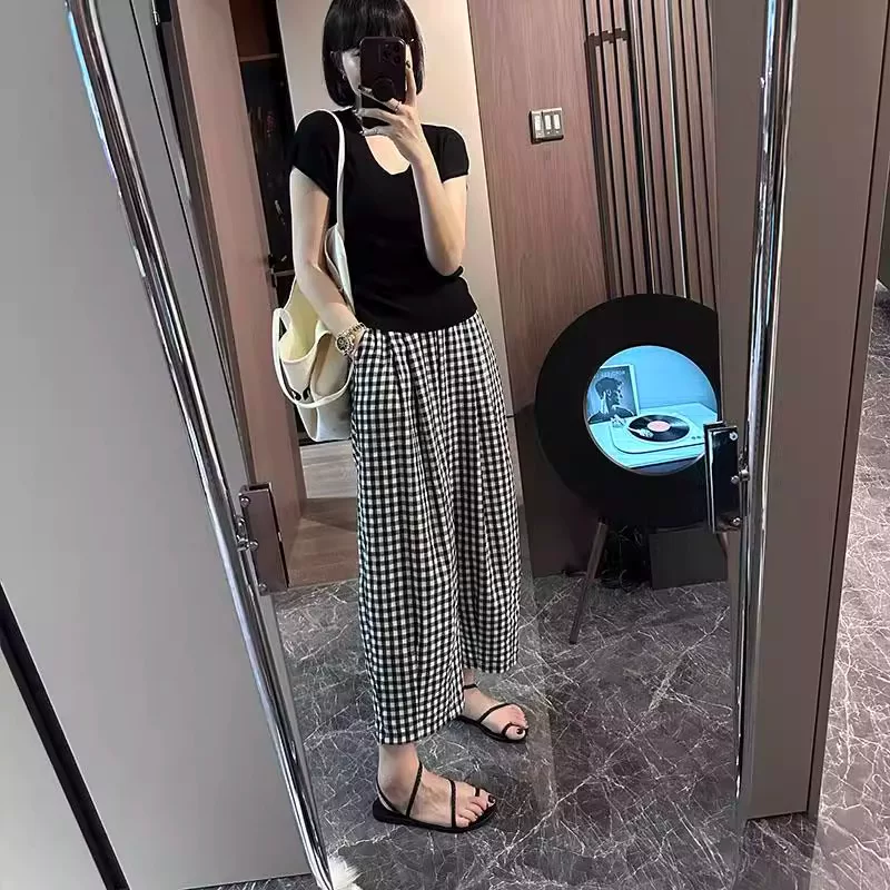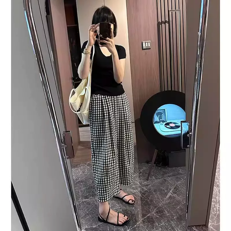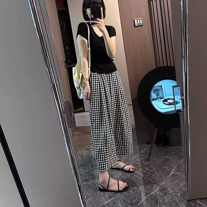 - Quần kẻ sọc thường ngày dành cho nữ, kiểu dáng mỏng mùa hè, cỡ lớn, lưng cao, dáng rộng, che hông, giảm béo, quần bóng dáng rộng, quần ống rộng.