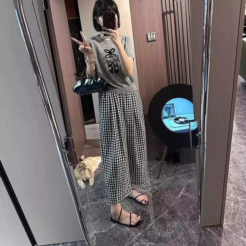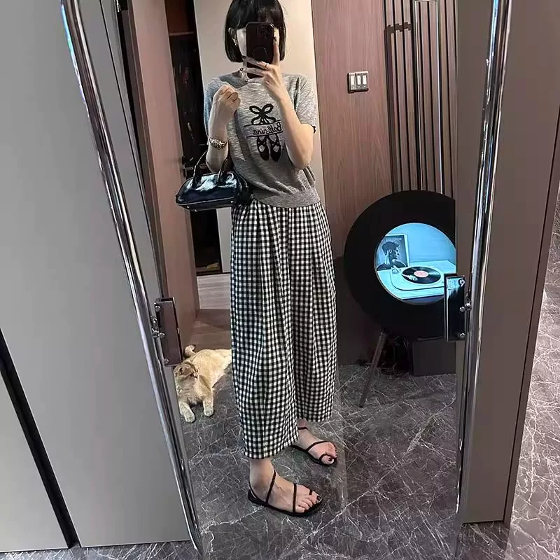 Quần kẻ sọc thường ngày dành cho nữ, kiểu dáng mỏng mùa hè, cỡ lớn, lưng cao, dáng rộng, che hông, giảm béo, quần bóng dáng rộng, quần ống rộng.