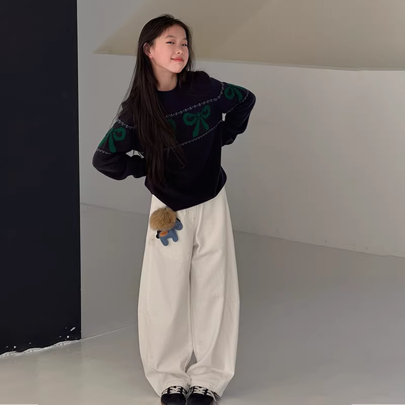 Quần kiểu dáng tối giản mùa đông kiểu dáng nhỏ nhắn dành cho bé gái, quần ống rộng có lót lông cừu màu trắng, quần dài trẻ em.