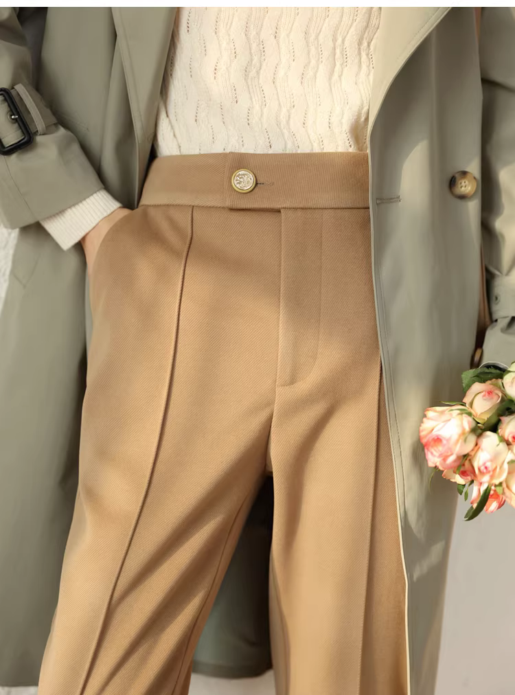 Quần lõi thu đông, phong cách đi làm, giảm béo, lót lông cừu, quần thuốc lá cạp cao có nút vàng, quần len nữ, quần dài