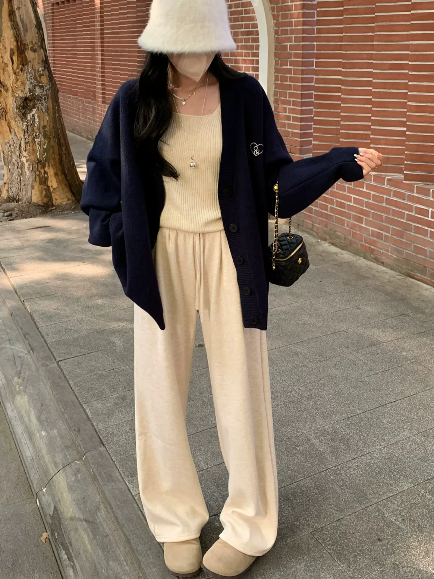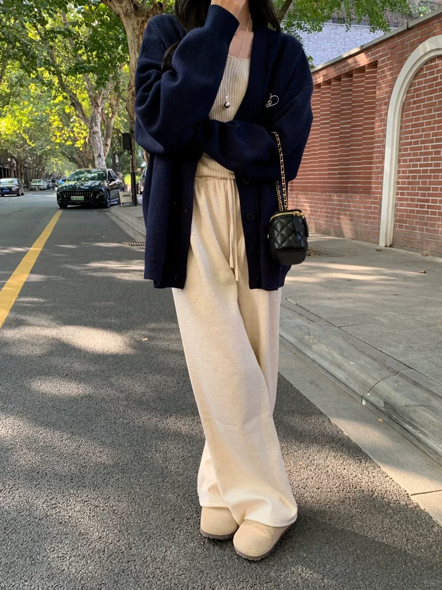 Quần lửng kiểu dáng lười biếng dành cho nữ, mùa thu đông, lót lông cừu, dày dặn, cỡ lớn, lưng cao, dáng rộng, dáng suông, quần ống rộng.