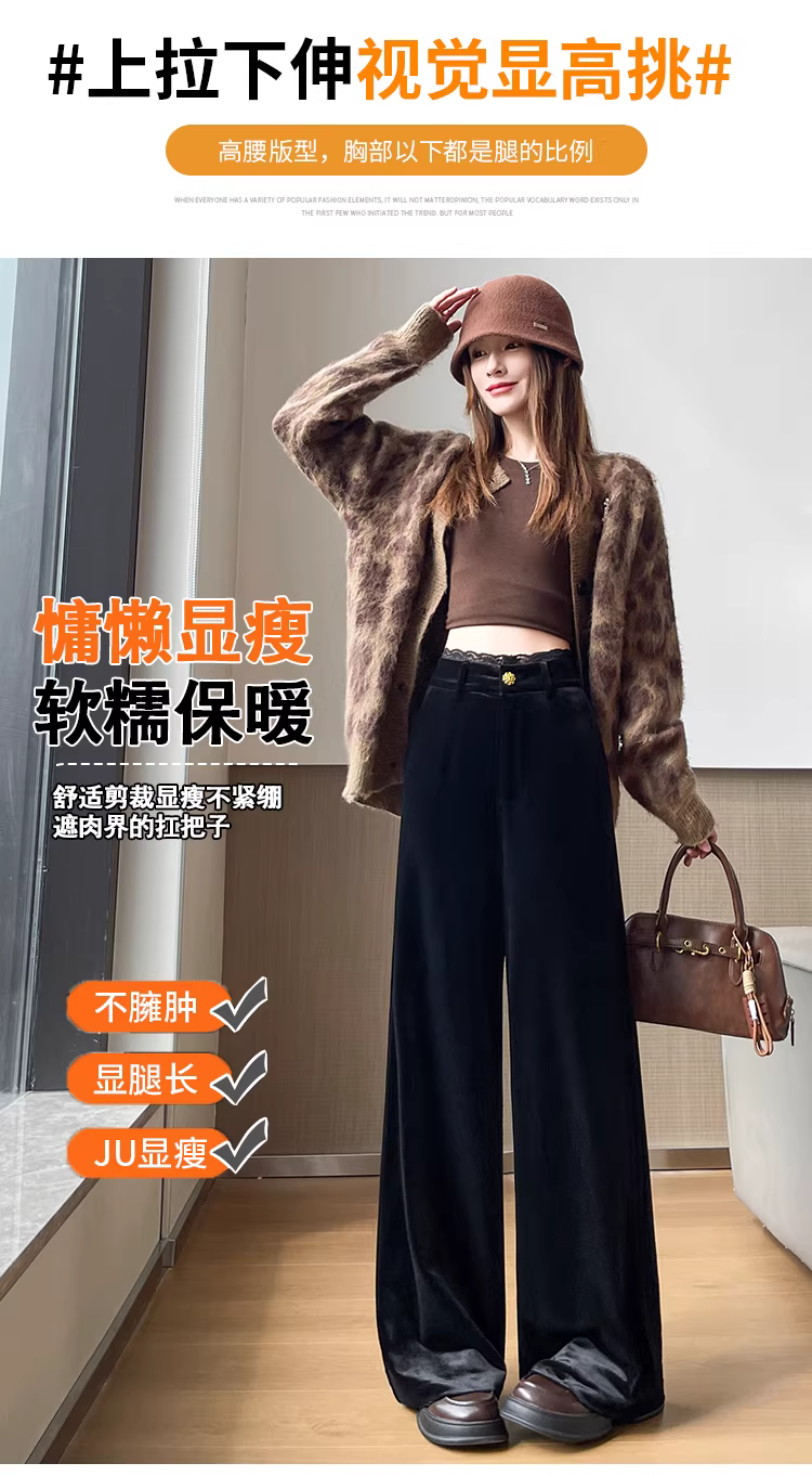 Quần nhung ống rộng nữ, thu đông, chất liệu mềm mại, dáng rộng, dài chấm đất, quần nhung dài.