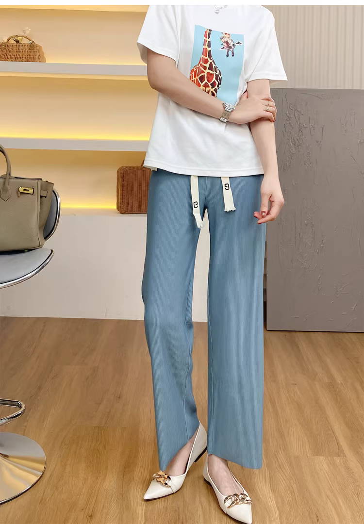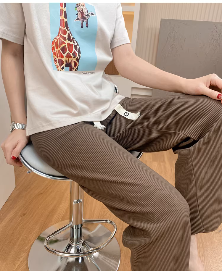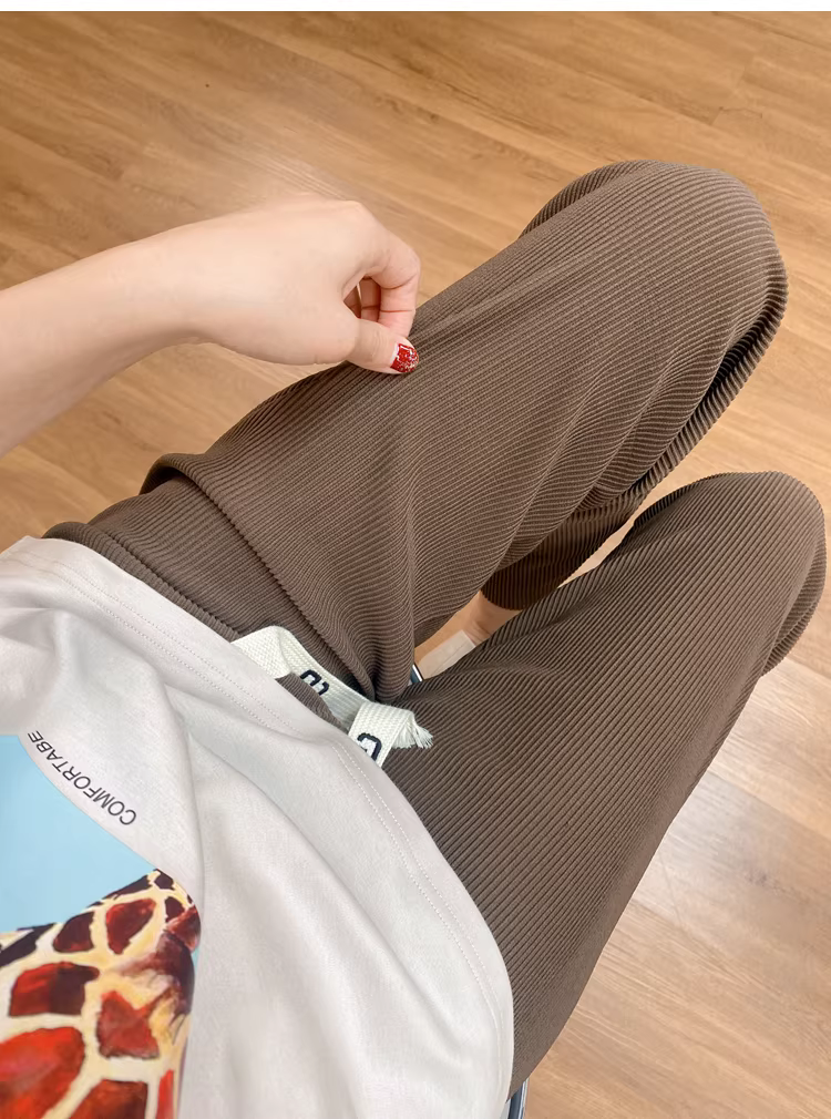 Quần nữ chất liệu gân ba chiều, thoải mái, dễ mặc, cạp cao, dáng ôm, có dây rút, phong cách thường ngày.