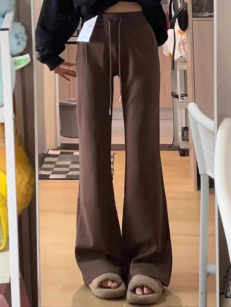 Quần ống loe dành cho nữ, cỡ lớn, mùa thu đông, lót lông cừu, lưng cao, dáng rộng, che hông, giảm béo, quần thể thao thông thường